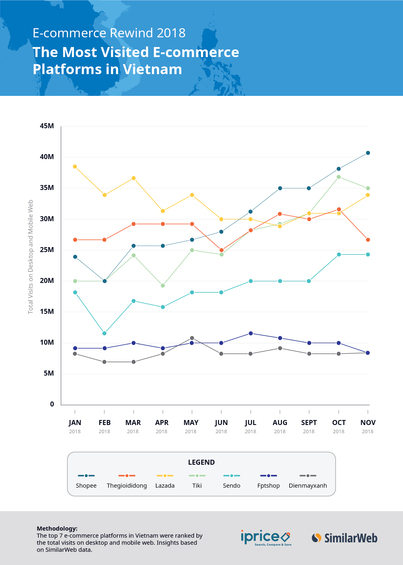 In the report, iPrice ranks the 10 most successful ecommerce platforms in 2018 based on average monthly web traffic. The final result shows that among this top 10, five of them are currently conducting business in Vietnam, including: Lazada, Shopee, Tiki, Thegioididong and Sendo.