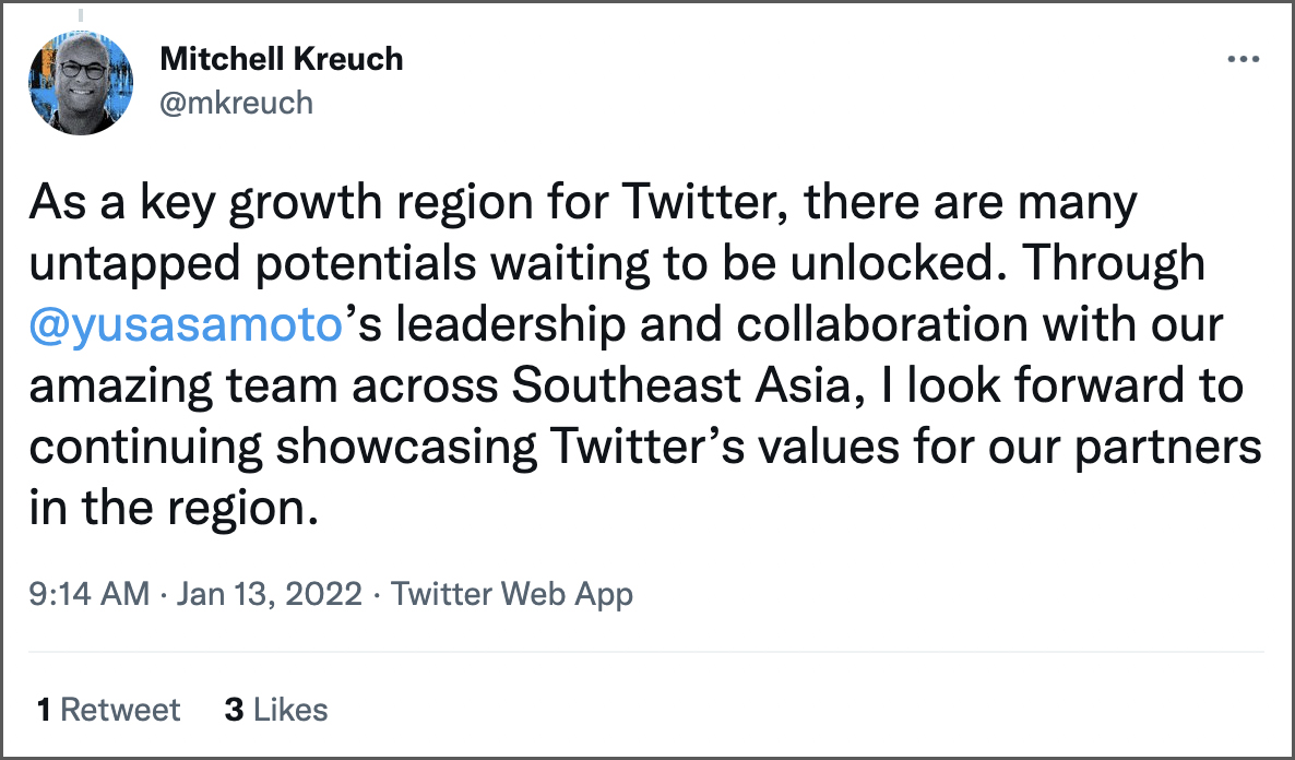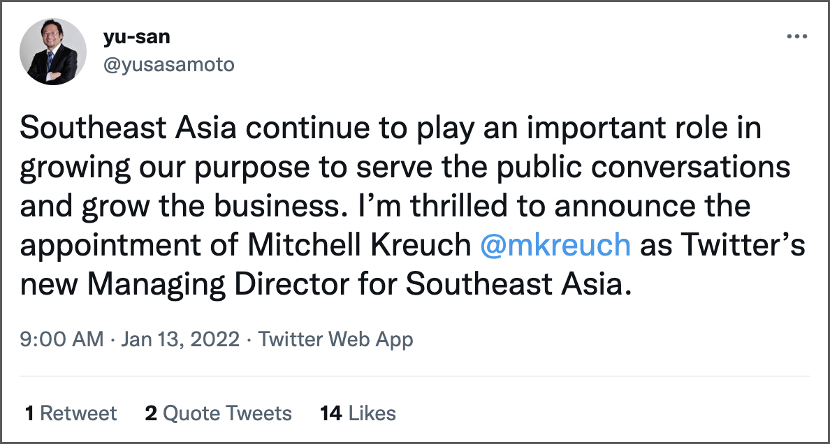 Today, Twitter announces that Mitchell Kreuch has been appointed as Twitter’s new Managing Director of Southeast Asia. Reporting to Yu Sasamoto, Twitter’s Vice President of Asia Pacific, Mitchell will be responsible for continuing and accelerating Twitter’s revenue growth in Southeast Asia. Prior to this role, he has led Twitter’s Agency Development in the Asia Pacific for the past two years and has been a key part of its successful agency approach across the region.