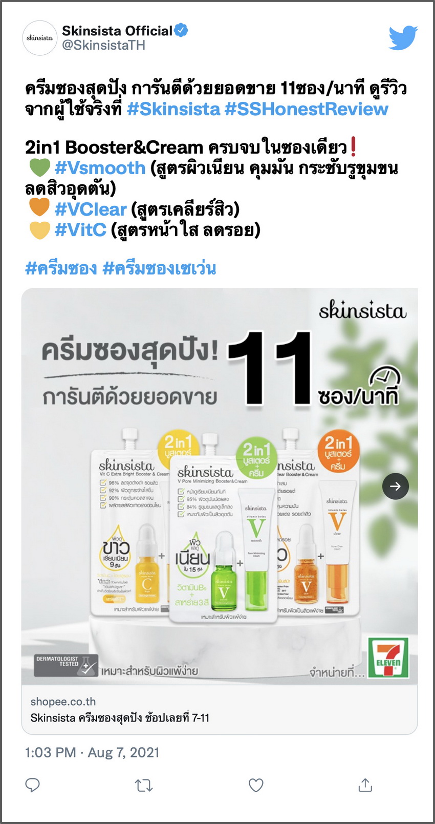 Twitter is what's happening in the world, and leading brands connect with people by aligning with passions that people care about. Winning Best Connection to Culture, Skinsista (@SkinsistaTH) leaned into the Thai Twitter beauty community and their desire for honest reviews, by launching the Skinsista #SSHonestReview campaign to promote authentic and honest feedback from their customers. Once the floodgates opened, the #BeautyTwitter community eagerly hopped on, with hashtag #SSHonestReview seeing 6.4 million engagements and nearly 170,000 reviews. Witnessing such great results, Skinsista sustained the conversations by Allowlisting those who Tweeted their reviews, creating a virtuous circle of positive conversations.