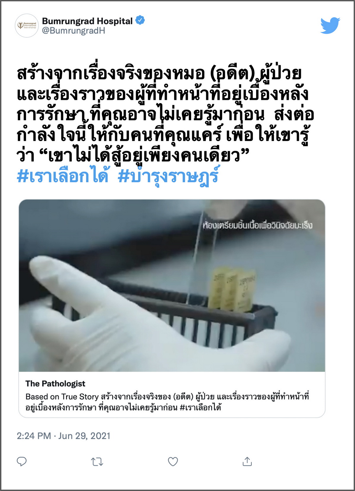 "We are honoured to receive #BestOfTweets 2021 for Best Campaign for Driving Positive Change in Society. Due to COVID-19 situation, more people have become aware of health and Twitter is one of the marketing tools that helped us to create real-time awareness and generate conversation. Bumrungrad International Hospital continuously pays attention to health literacy and through our #เราเลือกได้ campaign, we generated a lot of positive energy and encourage Thais to pay it forward and show others that they are not fighting alone," shared Teeraphol Ambhai – Senior Manager, Social Media Marketing for Bumrungrad International Hospital.
