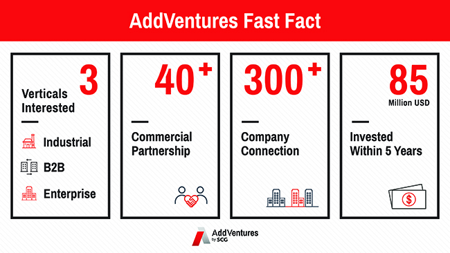 ดร.จาชชัว กล่าวอีกว่า ปัจจุบัน AddVentures ได้เดินหน้าสร้างความร่วมมือกับสตาร์ทอัพแล้วกว่า 40 ราย ในลักษณะพันธมิตรทางการค้า (Commercial Partnership) เกือบทั้งหมดเป็นสตาร์ทอัพด้าน B2B โดย AddVentures จะทำหน้าที่เสมือนเป็นตัวเชื่อมระหว่างสตาร์ทอัพและเอสซีจี รวมไปถึงบริษัทในเครือของเอสซีจีกว่า 300 บริษัท โดยเริ่มจากการทดลองเป็นลูกค้าของเอสซีจีก่อน และทำงานร่วมกันเพื่อตอบโจทย์ความต้องการของลูกค้าเป็นหลัก โดยมีทั้งโปรเจกต์ที่อยู่ในช่วงของการทำ Pilot Project และบางโปรเจกต์ที่เล็งเห็นว่าสามารถต่อยอดความร่วมมือทางธุรกิจ รวมไปถึงการพิจารณาการลงทุนต่อไปในอนาคต