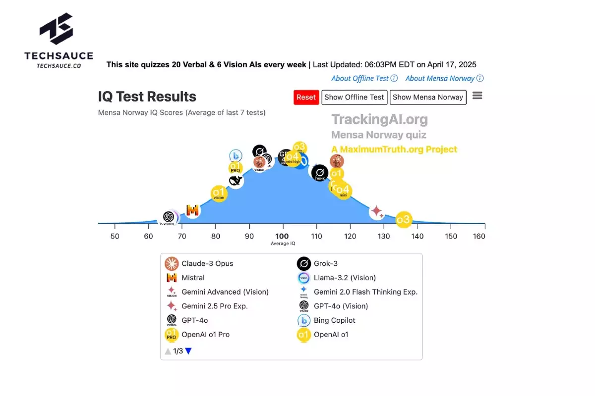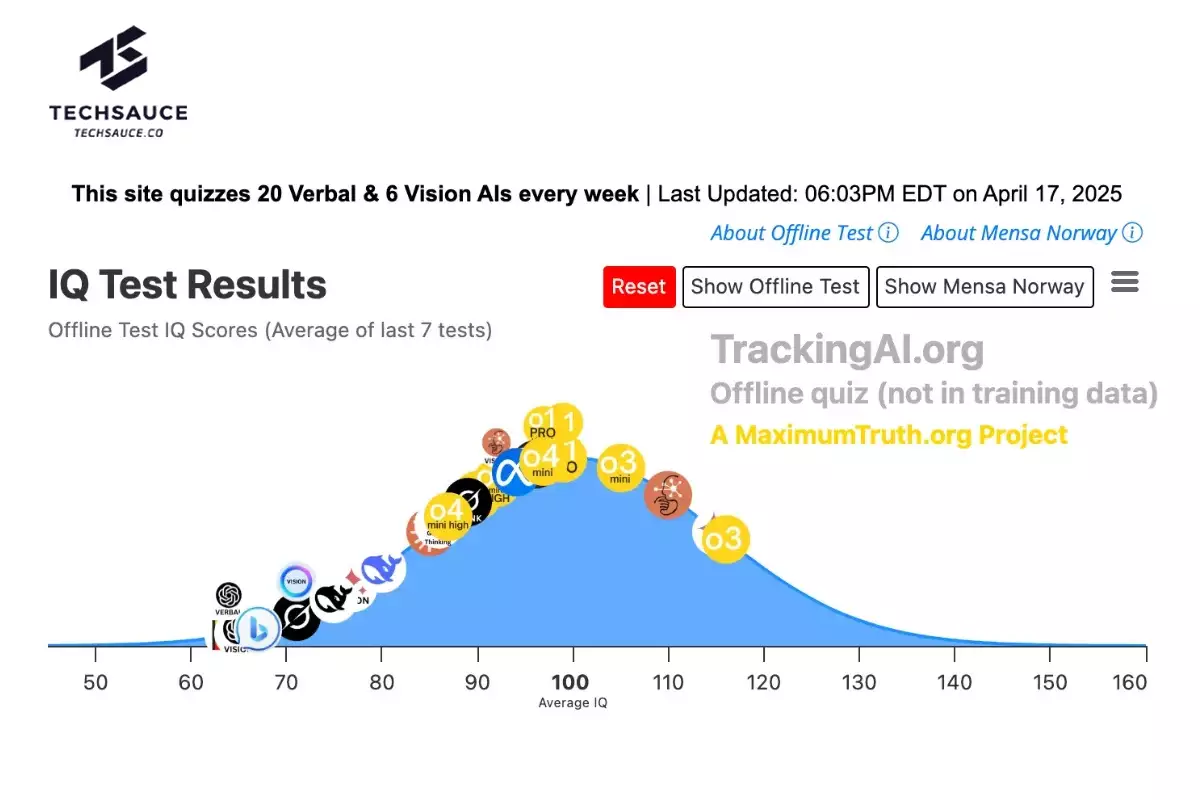 ผลทดสอบ IQ ของ AI ในแบบทดสอบ Mensa เมื่อวันที่ 17 เมษายน 2025