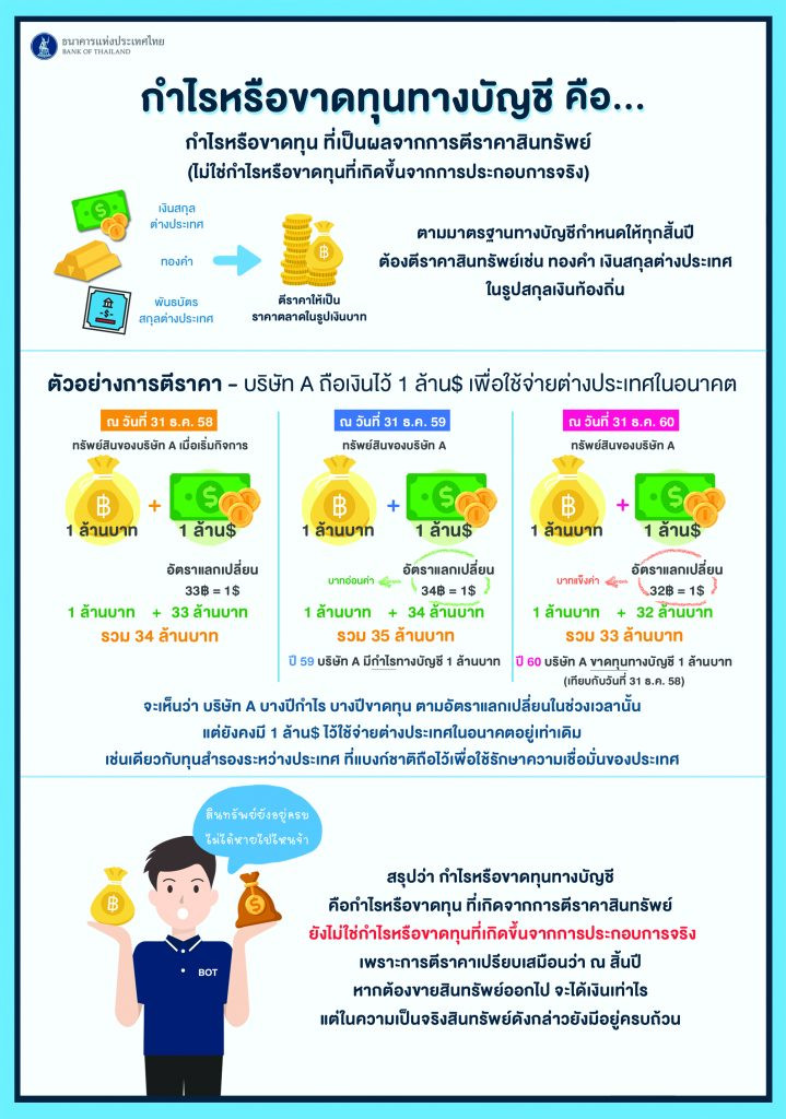 มูลค่าของเงินสำรองระหว่างประเทศในรูปของเงินบาทจะเปลี่ยนแปลงได้ทั้งเพิ่มขึ้นและลดลงตามอัตราแลกเปลี่ยน การขาดทุนจากการตีราคาทางบัญชี ไม่ได้แปลว่าเงินสำรองฯ ที่ ธปท. ถืออยู่จะด้อยค่าลงเรื่อยๆ จนสร้างปัญหาให้แก่ความมั่นคงทางเศรษฐกิจของประเทศ