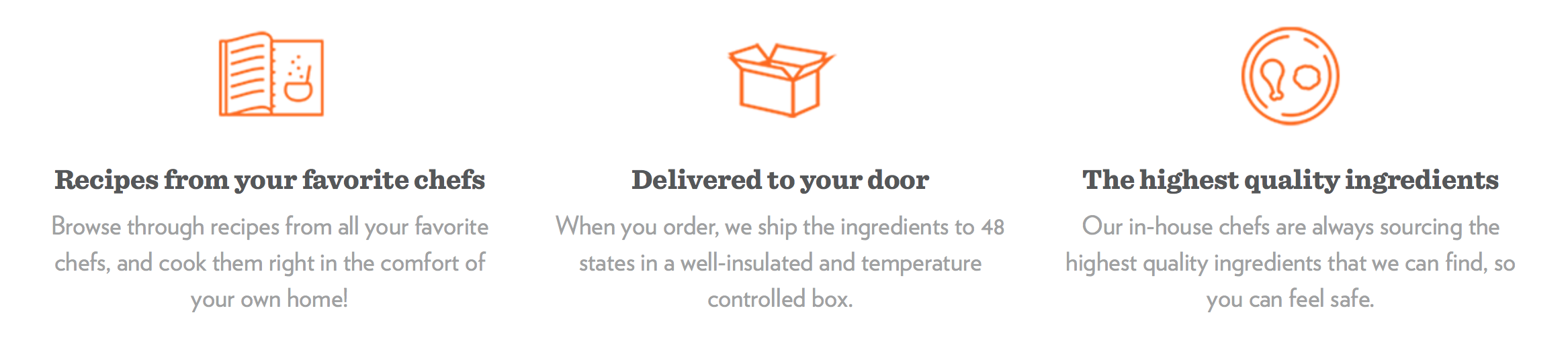 ดังนั้น ลูกค้าที่ต้องการสั่งอาหารและวัตถุดิบจาก Chef’d จึงไม่ต้องลงทะเบียนเป็นสมาชิกแบบประจำ แต่จะมีให้บริการแบบคิดเป็นครั้งๆ ไป โดยเมนูอาหารและวัตถุดิบเหล่านั้นจะได้รับการสร้างสรรค์โดยนิตยสารอาหารและเชฟที่มีชื่อเสียง