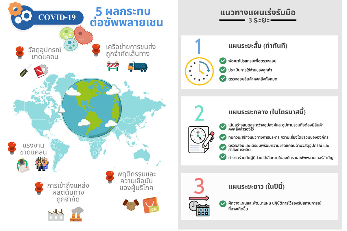 จากการที่โรคติดเชื้อไวรัสโคโรนาระบาด และแพร่กระจายอย่างรวดเร็วยิ่งกว่าการระบาดโรคซาร์สในปี 2546 ผู้จัดการด้านซัพพลายเชนจะต้องชะลอการปรับตัว และวางแผนรับมือกับเหตุการณ์ที่จะเกิดขึ้นในอนาคต