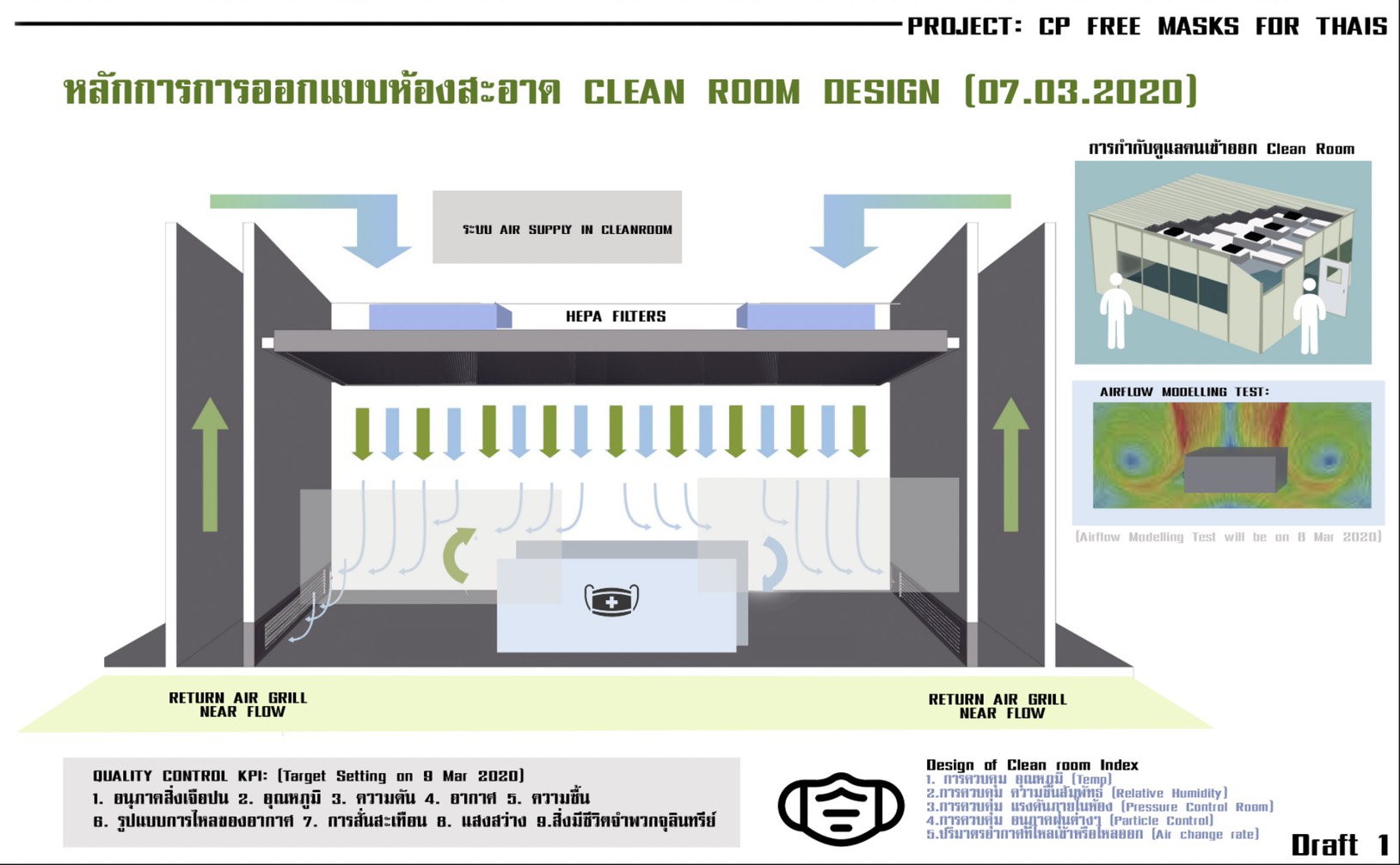 หลังจากเจ้าสัวธนินท์ ประกาศผลิตหน้ากากอนามัยแจกฟรีใน 5 สัปดาห์ สิ่งที่กลุ่มซีพีเร่งดำเนินการเป็นประการแรกคือ ด้านการควบคุมคุณภาพสถานที่ ซึ่งถือว่าเป็นสิ่งที่สำคัญ ก่อนการออกแบบก่อสร้างด้วยซ้ำ นั่นคือเรื่องของห้องปลอดเชื้อ Clean Room เพื่อรองรับเครื่องจักร และกระบวนการผลิตหน้ากากอนามัยแจกฟรี