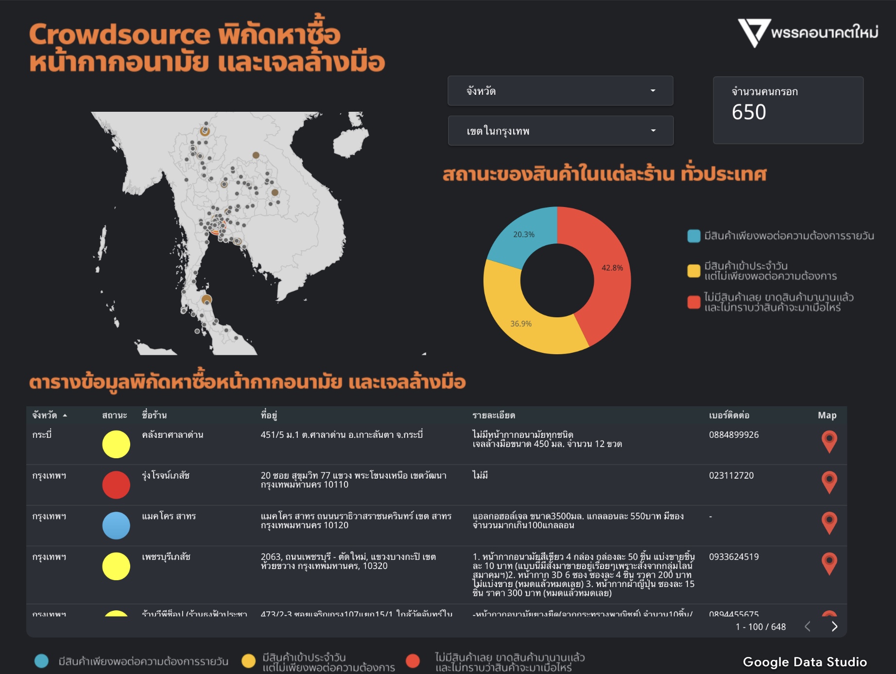ล่าสุดโลกออนไลน์ได้มีการแชร์จากเว็บไซต์ อนาคตใหม่ - Futureforward ที่ได้มีการเปิด Crowdsource แผนที่ฉบับประชาชน รวบรวมข้อมูลจากประชาชนมาทำเป็นแผนที่เพื่อชี้พิกัดในการหาซื้อหน้ากากอนามัย และเจลล้างมือ โดยข้อมูลที่ได้รับนั้นจะมาจากการที่ประชาชนเข้ามากรอกข้อมูลใน Google Form ที่ปรากฎบนเว็บไซต์ โดยประชาชน 1 คนจะสามารถกรอกชื่อกี่ร้านก็ได้ เพื่อให้คนอื่น ๆ สามารถอัพเดทข้อมูลได้แบบ Real Time