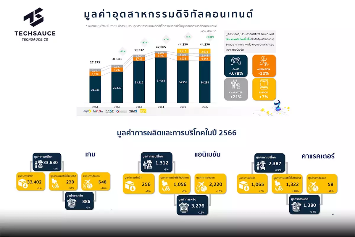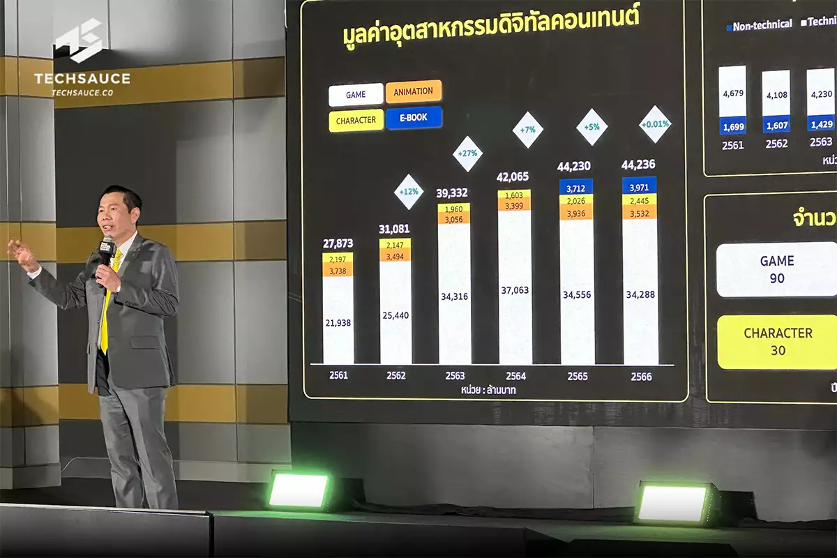 อุตสาหกรรมดิจิทัลคอนเทนต์ ประกอบด้วย เกม แอนิเมชัน คาแรกเตอร์ และหนังสืออิเล็กทรอนิกส์ จากผลสำรวจมูลค่าอุตสาหกรรมดิจิทัลคอนเทนต์ของสำนักงานส่งเสริมเศรษฐกิจดิจิทัล ในปี 2566 พบว่า อุตสาหกรรมดิจิทัลคอนเทนต์ไทยมีมูลค่า 44,236 ล้านบาท และมีแนวโน้มเติบโตขึ้นเรื่อย ๆ แต่หนึ่งในความท้าทายคือ การขาด Intellectual Property (IP) ของไทย เพราะส่วนใหญ่มีการนำเข้าสูง โดยเฉพาะอุตสาหกรรมเกม ซึ่งนำเข้าเกือบ 100% ส่วนอุตสาหกรรมคาแรกเตอร์ มีการนำเข้าสูง แต่ส่งออกได้น้อยเช่นเดียวกัน และในส่วนของอุตสาหกรรมแอนิเมชัน มีการส่งออกมากกว่านำเข้า แต่ส่วนใหญ่แล้วไทยมักเป็น Outsource จึงยังคงขาดแคลน IP ไทยเช่นกัน แสดงให้เห็นว่ายังมีช่องว่างมหาศาลให้คนไทยพัฒนาผลงานออกสู่ตลาดทั้งในและต่างประเทศ