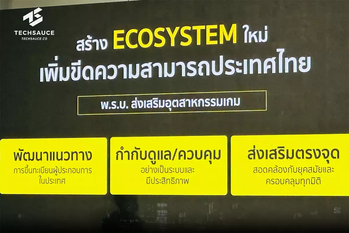 "กระทรวงดีอีอยู่ระหว่างการผลักดันร่าง พ.ร.บ.ส่งเสริมอุตสาหกรรมเกม ทุกท่านคงจะทราบดีว่า เดิม พ.ร.บ.ว่าด้วยภาพยนตร์และเกมอยู่ด้วยกัน ภายหลังแยกกันเป็น 2 ฉบับ ซึ่งในส่วนของ พ.ร.บ.ส่งเสริมอุตสาหกรรมเกม ขณะนี้การยกร่างดําเนินการเสร็จแล้วนะครับ อยู่ระหว่างการนําเสนอเข้าสู่การพิจารณาของสภาผู้แทนราษฎร และพยายามผลักดันให้มีการนําเข้าสมัยประชุมในโอกาสที่ใกล้จะถึงนี้ เพื่อกําหนดมาตรฐาน ซึ่งเกี่ยวเนื่องกับการสร้างรายได้ทางเศรษฐกิจ" นายประเสริฐกล่าว