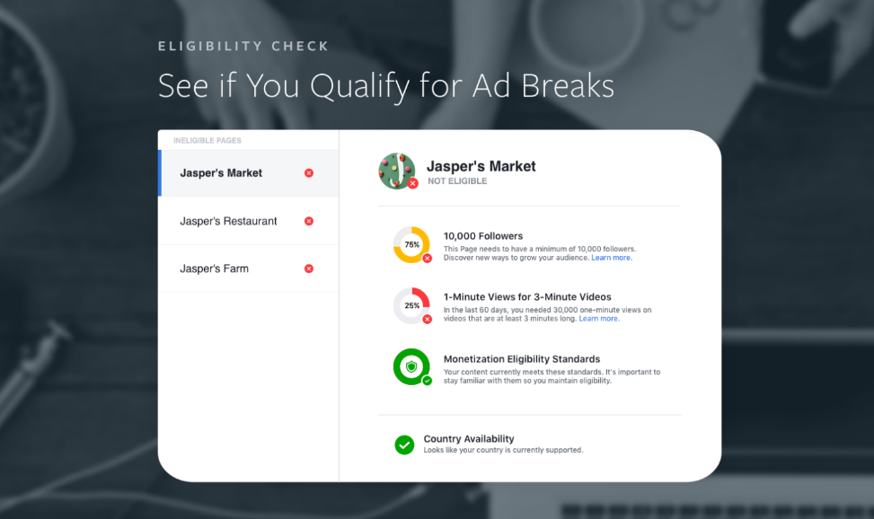 ก่อนหน้านี้ Facebook เปิดตัว Ad Break ฟีเจอร์ช่วงพักโฆษณาสำหรับคลิปวีดีโอบนเพจ เปิดช่องให้คนทำเพจที่เป็นผู้ผลิตคอนเทนต์สร้างรายได้จากวิดีโอแบบยาวครั้งแรกเมื่อเดือนสิงหาคม 2561 ใน 5 ประเทศ คือ สหรัฐอเมริกา สหราชอาณาจักร ไอร์แลนด์ ออสเตรเลีย และนิวซีแลนด์ Facebook ระบุว่าเพียงแค่ 2 สัปดาห์แรก ของผู้ผลิตคอนเทนต์และครีเอเตอร์ที่มีคุณสมบัติที่เหมาะสมใน 5 ประเทศที่เปิดตัวจำนวน 15 เปอร์เซ็นต์ก็เปิดใช้ฟีเจอร์นี้แล้ว
