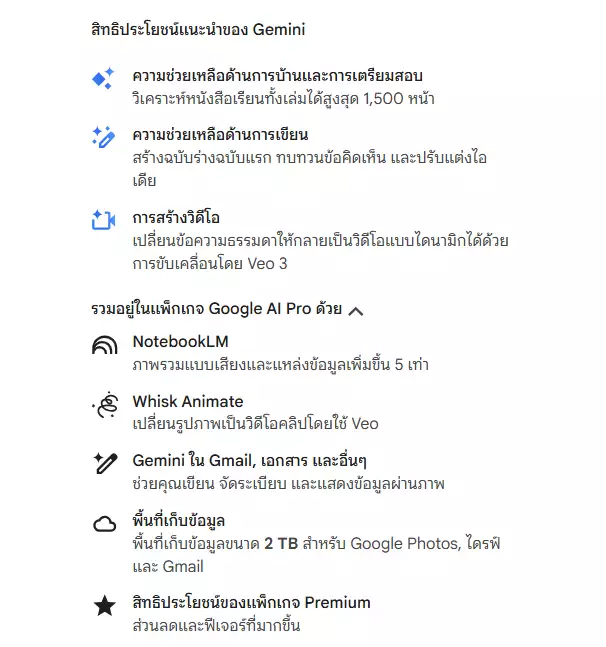 นอกจากใช้ได้ฟรี 12 เดือนเต็ม (มูลค่า 750 บาทต่อเดือน) ยังได้แพ็กเกจ Google AI Pro มาพร้อมความสามารถครบชุด ทั้ง Gemini และเครื่องมือ AI ระดับโปร เช่น