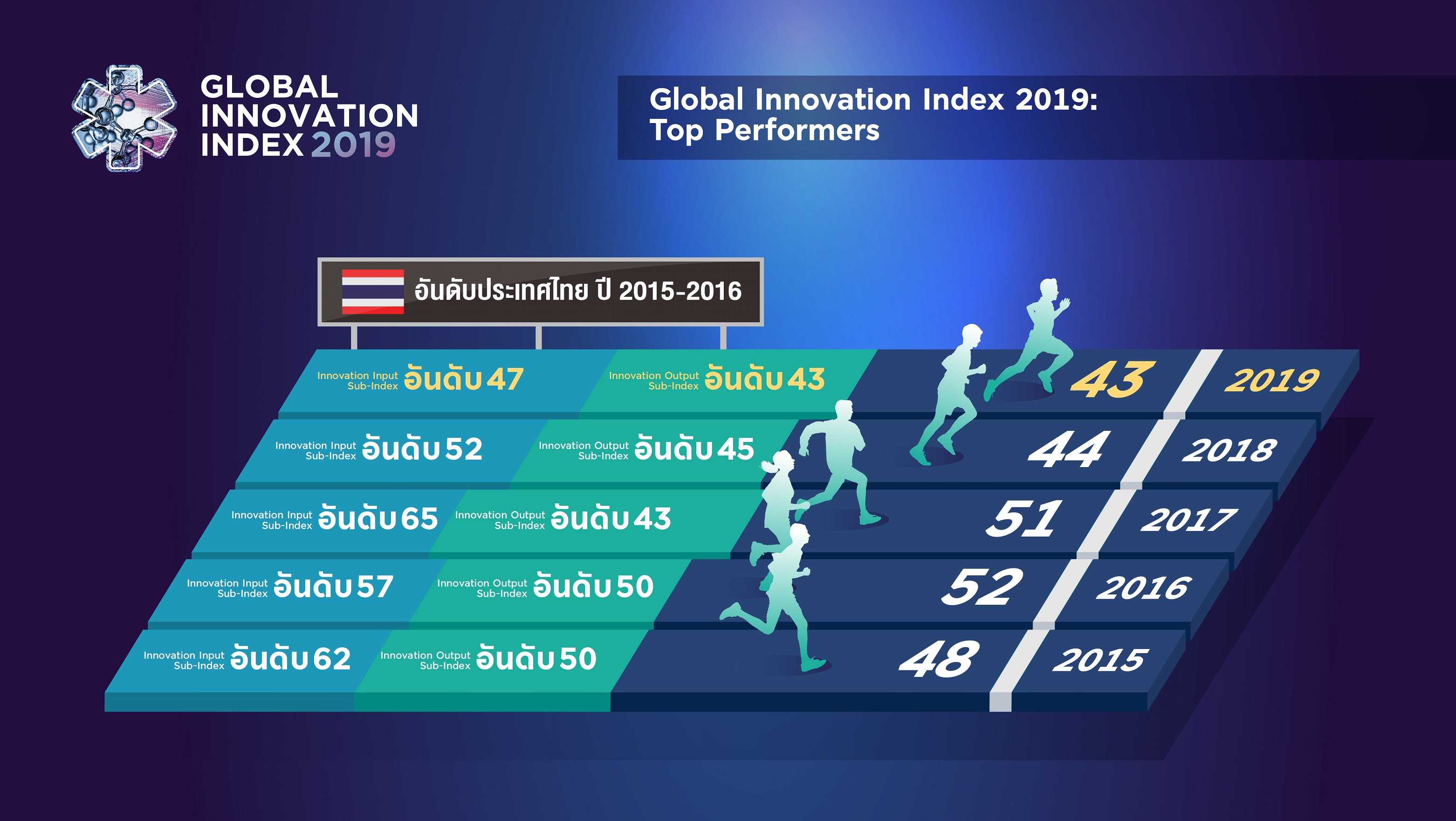 ดร. สุวิทย์ เมษินทรีย์ รัฐมนตรีว่าการกระทรวงการอุดมศึกษา วิทยาศาสตร์ วิจัยและนวัตกรรม เปิดเผยว่า ในปี 2019 ประเทศไทยได้รับการจัดอันดับความสามารถด้านนวัตกรรมอยู่อันดับที่ 43 ขยับอันดับขึ้น 1 อันดับ จากปี 2018 โดยในปีนี้ประเทศไทยมีการปรับตัวดีขึ้นทั้งทางด้านปัจจัยเข้าทางนวัตกรรม (Innovation input sub-index) จากเดิมอันดับที่ 52 เลื่อนขึ้นเป็นอันดับที่ 47 และปัจจัยย่อยผลผลิตทางนวัตกรรม (Innovation output sub-index) ที่ปรับขึ้นจากอันดับที่ 45 เลื่อนขึ้นเป็นอันดับที่ 43 ซึ่งเมื่อเปรียบเทียบกับกลุ่มประเทศกลุ่มรายได้ปานกลางระดับบน (upper middle-income economies)ประเทศไทยอยู่ในอันดับ 4 รองจากจีน มาเลเซีย และบัลแกเรีย จากจำนวน 34 ประเทศ ที่ประเทศไทยมีอันดับที่ดีกว่าค่าเฉลี่ยในทุกปัจจัย ยกเว้นปัจจัยด้านโครงสร้างพื้นฐาน แต่หากเปรียบเทียบกับกลุ่มประเทศในภูมิภาคเอเชียตะวันออกเฉียงใต้ เอเชียตะวันออกและโอเชียเนีย ประเทศไทยอยู่ในอันดับ 10 จากจำนวน 15 ประเทศ