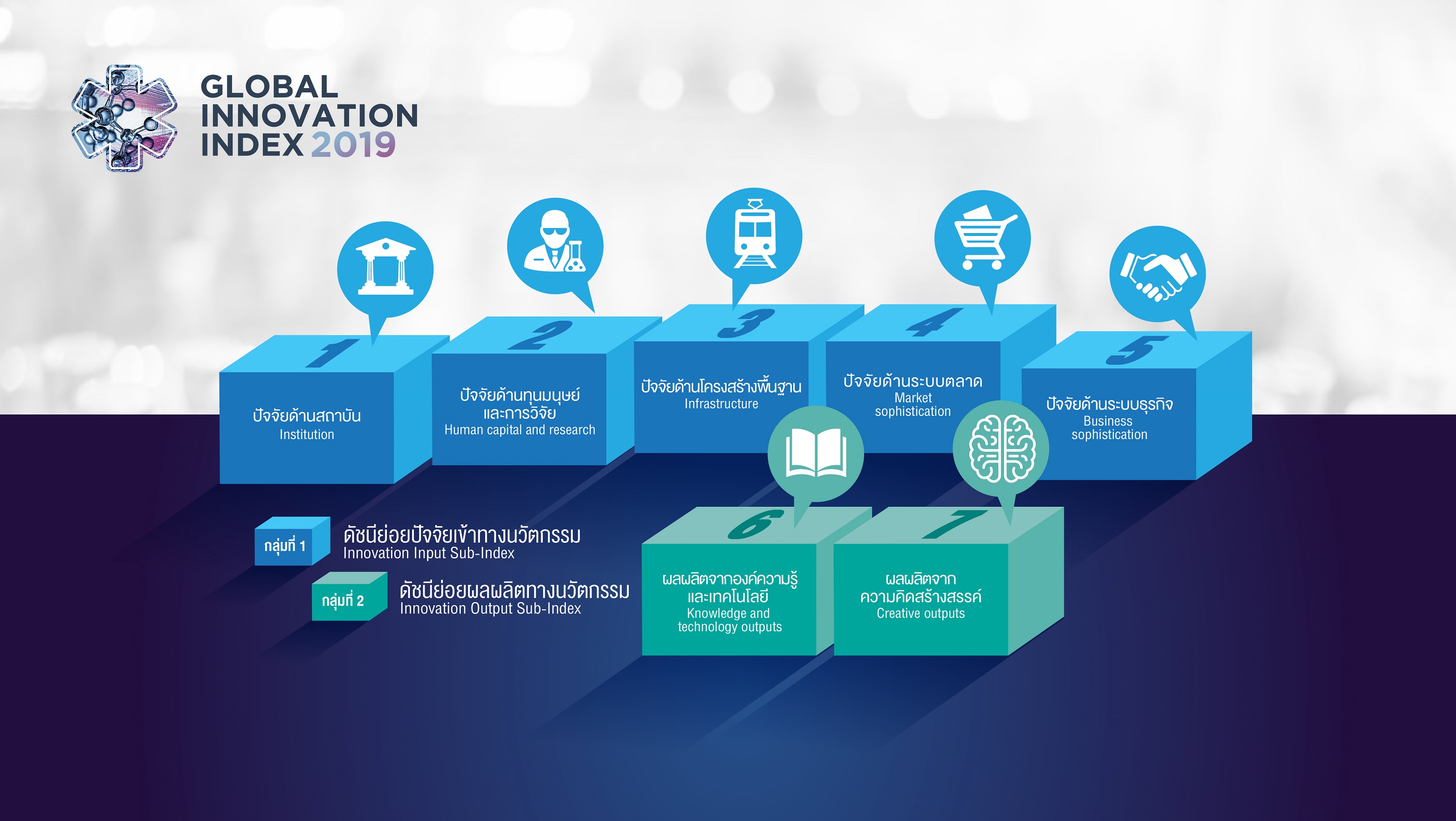 ด้าน ดร.พันธุ์อาจ ชัยรัตน์ ผู้อำนวยการสำนักงานนวัตกรรมแห่งชาติ (องค์การมหาชน) ดัชนี GII ประกอบด้วย ดัชนีย่อย 2 ด้าน ได้แก่ ดัชนีย่อยปัจจัยเข้าทางนวัตกรรม (Innovation input sub-index)และ ดัชนีย่อยผลผลิตทางนวัตกรรม (Innovation output sub-index) โดยภายใต้ 2 ดัชนีย่อยนี้ ได้แบ่งองค์ประกอบออกเป็น 7 ปัจจัยเสาหลัก (Pillar) ได้แก่ 1) ปัจจัยด้านสถาบัน 2) ปัจจัยด้านทุนมนุษย์และการวิจัย 3) ปัจจัยด้านโครงสร้างพื้นฐาน 4) ปัจจัยด้านระบบตลาด และ 5) ปัจจัยด้านระบบธุรกิจ 6) ผลผลิตจากองค์ความรู้และเทคโนโลยี และ 7) ผลผลิตจากความคิดสร้างสรรค์ ทั้งนี้ GII นี้ ถือเป็นอีกหนึ่งดัชนีสำคัญด้านนวัตกรรมที่ได้รับการยอมรับทั่วโลก ซึ่งสะท้อนความสามารถด้านนวัตกรรมของประเทศทั้งในปัจจัยย่อย การเปรียบเทียบเชิงเวลา และการเปรียบเทียบเชิงแข่งขัน