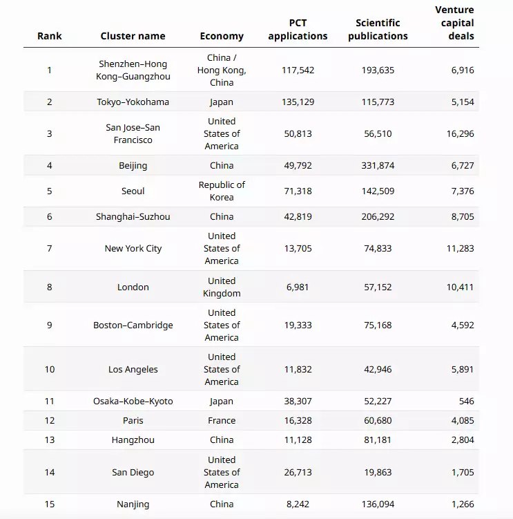 อันดับ 1 เริ่มจาก เซินเจิ้น ฮ่องกง กวางโจว ที่ขึ้นเป็นแชมป์โลกด้วยความสมดุลทั้งสามด้าน ไม่ว่าจะเป็นสิทธิบัตรระหว่างประเทศ (ยื่นกว่า 117,000 ฉบับ), ผลงานวิจัยตีพิมพ์ (เกือบ 200,000 เรื่อง) และจำนวนดีล VC กว่า 6,900 ดีล เมืองนี้มีครบทุกอย่าง ทั้งมหาวิทยาลัย นักวิจัย โรงงานผลิต และนักลงทุน ทำให้จากห้องแล็บสามารถไปถึงตลาดได้จริงในเวลาอันสั้น