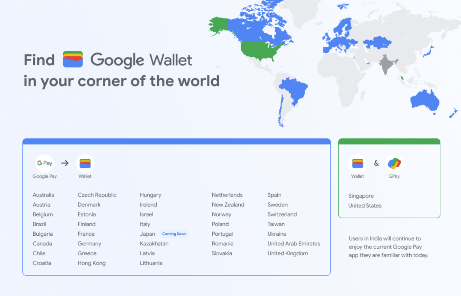 แน่นอนว่าหาก Wallet ทำหน้าที่จ่ายเงินไม่ได้ ก็คงจะเรียกตัวเองว่ากระเป๋าตังค์ไม่ได้ ดังนั้นแอปฯสำหรับโอนเงินเดิมของ Google อย่าง Google Pay จะถูกอัพเดตเป็น Google Wallet ซึ่งปัจจุบัน Google Pay มีให้บริการใน 42 ประเทศ และยังเป็น Digital wallet หลักของผู้ใช้งานใน 39 ประเทศ แต่ในสหรัฐอเมริกาและสิงคโปร์ Google Pay จะยังคงเป็นแอปฯที่เน้นการชําระเงิน ในขณะที่แอปฯ Wallet ก็จะอยู่ควบคู่ไปกับการจัดเก็บบัตรดิจิทัล