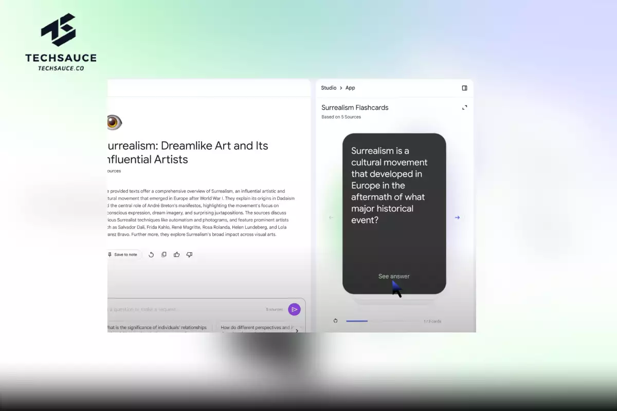เครื่องมือโต้ตอบเหล่านี้จะดึงคำศัพท์สำคัญ, วันที่, และแนวคิดหลักจากแหล่งข้อมูลของคุณมาสร้างเป็นสื่อการเรียนรู้ส่วนบุคคล คุณสามารถกำหนดหัวข้อ, ปรับระดับความยาก, และแชร์ชุดการเรียนรู้เหล่านี้ให้เพื่อนร่วมทีมได้ง่ายๆ ผ่านลิงก์เดียว แต่ความพิเศษยังไม่หมดเพียงเท่านั้น หากคุณไม่เข้าใจคำศัพท์บนแฟลชการ์ด หรือตอบคำถามในแบบทดสอบผิด เพียงคลิกปุ่ม "อธิบาย (Explain)" NotebookLM ก็จะสร้างคำอธิบายโดยละเอียดพร้อมชี้กลับไปยังแหล่งอ้างอิงในเอกสารต้นฉบับให้ทันที