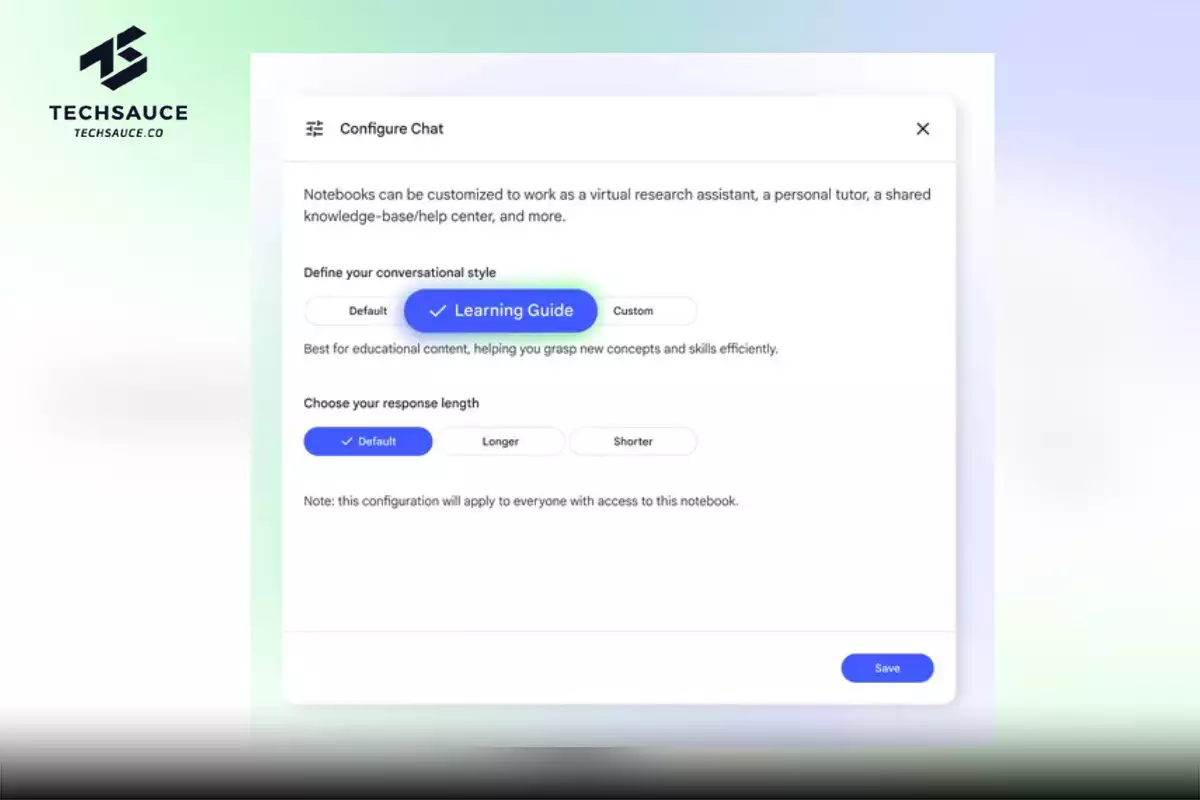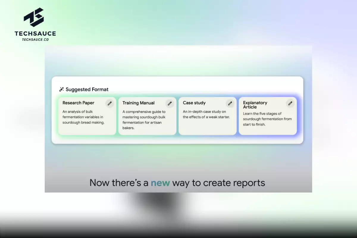 ความน่าทึ่งคือ NotebookLM สามารถวิเคราะห์ธีม, หัวข้อ, หรืออุตสาหกรรมจากเอกสารของคุณ และ "แนะนำ" รูปแบบรายงานที่เหมาะสมให้โดยอัตโนมัติ เช่น หากคุณอัปโหลดบทความวิชาการด้านเศรษฐศาสตร์ AI อาจแนะนำให้สร้าง "อภิธานศัพท์คำศัพท์สำคัญ" หรือหากคุณอัปโหลดร่างเรื่องสั้น AI ก็อาจแนะนำให้สร้าง "บทวิเคราะห์ตัวละคร" สิ่งนี้ช่วยให้ผู้ใช้สามารถสร้างสรรค์ผลงานคุณภาพสูงที่ปรับแต่งมาเพื่อวัตถุประสงค์เฉพาะทางได้อย่างง่ายดาย
