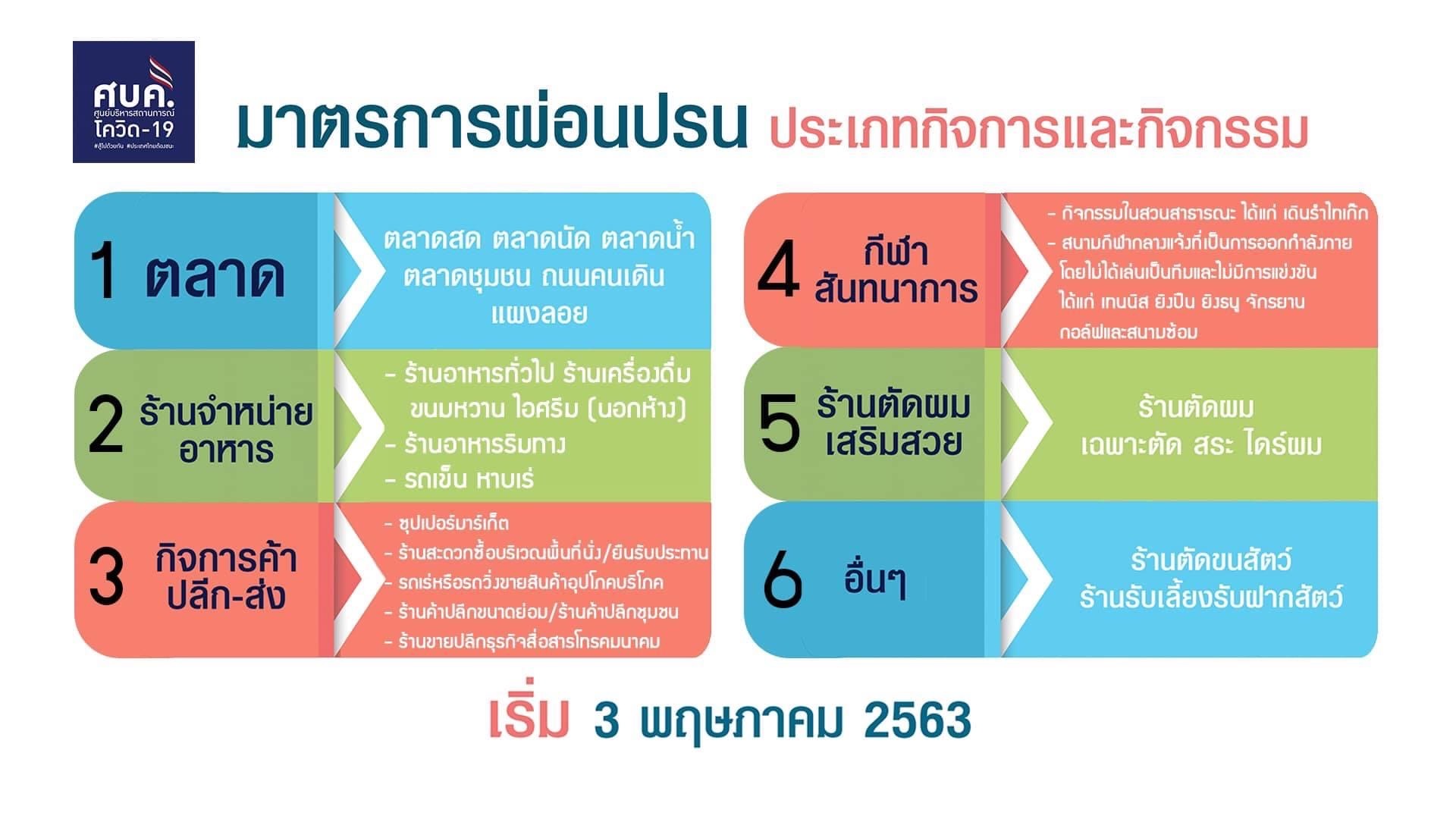 นพ.ทวีศิลป์ วิษณุโยธินโฆษกศูนย์บริหารสถานการณ์การแพร่ระบาดของโรคติดเชื้อไวรัส COVID-19 ได้ แถลงข่าวสถานการณ์ COVID-19 ในประเทศไทย โดยทางศบค.ได้มีมติที่ประชุมเรื่อง มาตรการผ่อนปรนประเภทกิจการและกิจกรรม 6 ธุรกิจ เริ่ม 3 พฤษภาคม 2563 นี้