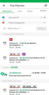 เมื่อผู้ใช้เลือกจุดหมายปลายทางผ่าน Trip Planner จะสามารถดูตัวเลือกการเดินทางขนส่งสาธารณะทั้งหมดที่มีอยู่พร้อมกับเวลาออกเดินทาง และเวลามาถึงแบบเรียลไทม์ นอกจากนี้ยังมีคำแนะนำเกี่ยวกับตัวเลือกการคมนาคมในระยะทาง เช่น GrabShare หรือ GrabTaxi ทั้งขาไปและขากลับจากระบบขนส่งสาธารณะที่สามารถจองได้ทันที