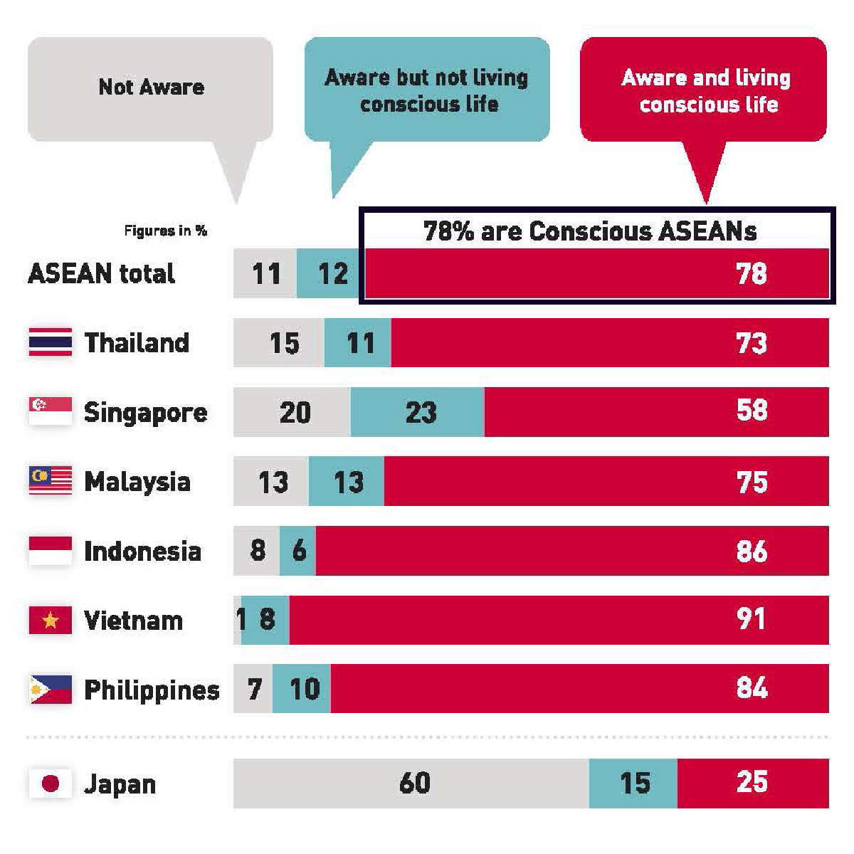 คนอาเซียนประมาณร้อยละ 90 รู้จักคำว่า Conscious Lifestyle หรือวิถีชีวิตที่ใส่ใจสังคม-สิ่งแวดล้อม และเกือบร้อยละ 80 นำความใส่ใจสังคมและสิ่งแวดล้อมมาปฏิบัติจริงในการดำเนินชีวิตประจำวัน
