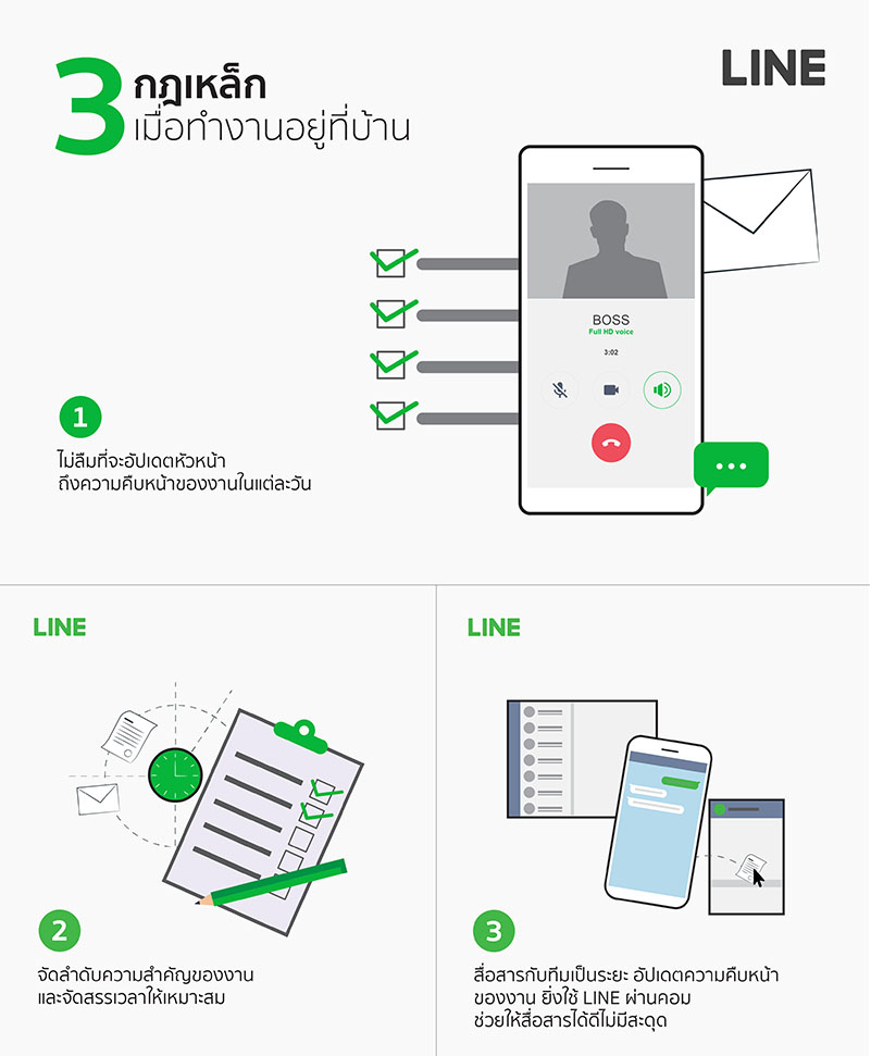 การสื่อสารก็เป็นหัวใจของการทำงานที่บ้านจริง ๆ หลายคนรู้แล้วว่าหากมีเรื่องไม่ด่วนก็ทักแชตผ่าน LINE Chat ก่อนได้ หรือต้องการคุยงานแบบหลายคน ก็สร้าง LINE Group Chat กลุ่มแชตที่จะทำให้เพื่อนร่วมงานได้อัพเดทไปพร้อม ๆ กัน ซึ่งรับได้สูงสุด 500 คนต่อกรุ๊ปเลย