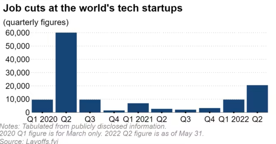 Layoffs.fyi ซึ่งได้ทำการสำรวจจำนวนของคนที่ตกงานในบริษัทสตาร์ทอัพเทคโนโลยีทั่วโลกมาตั้งแต่ช่วงการระบาดครั้งใหญ่เมื่อเดือนมีนาคม ปี 2020 ได้รายงานว่า ตั้งแต่เดือนเมษายนจนถึงพฤษภาคมมีจำนวนของพนักงานที่ถูกเลิกจ้างกว่า 20,514 คน บ่งชี้ว่าตลาดแรงงานในภาคของธุรกิจสตาร์ทอัพเทคโนโลยีนั้นแย่ลงไปมาก เมื่อเทียบกับสถานการณ์การเลิกจ้างพนักงานในช่วงวิกฤติโรคระบาดเมื่อเดือนเมษายน-มิถุนายนในปี 2020 และการเลิกจ้างส่วนใหญ่มักจะเกิดในสตาร์ทอัพอเมริกาทั้งสิ้น
