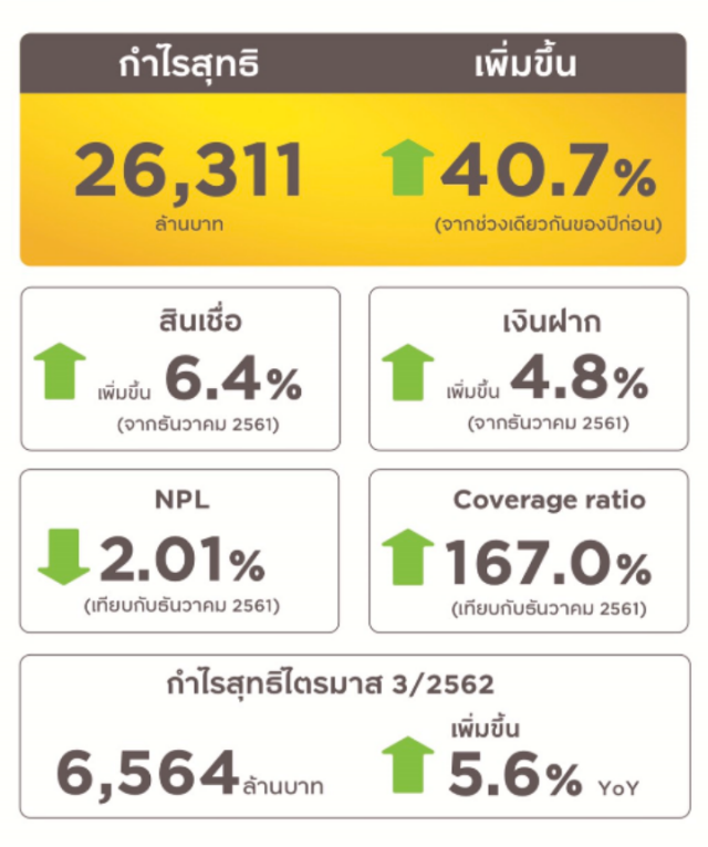 • กำไรสุทธิ: จำนวน 26.3 พันล้านบาท เพิ่มขึ้น 40.7% จากช่วงเวลาเดียวกันของปี 2018