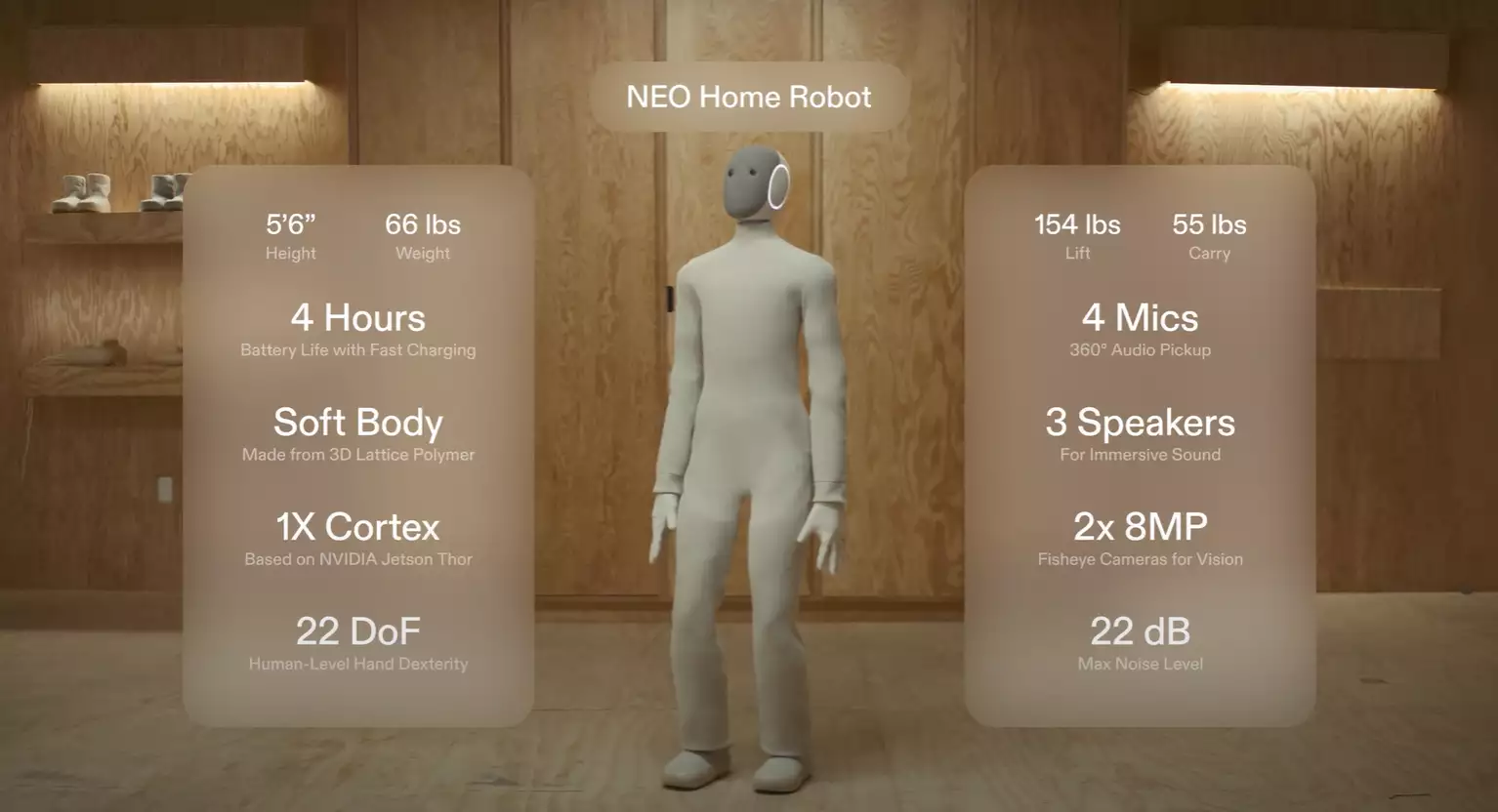 NEO ใช้เทคโนโลยี Tendon Drive ที่จดสิทธิบัตรเฉพาะของ 1X ทำให้การเคลื่อนไหวดูนุ่มนวล ไม่แข็งทื่อเหมือนหุ่นยนต์ทั่วไป มือขยับได้ถึง 22 จุด ร่างกายเป็นโครงสร้างพอลิเมอร์นุ่ม น้ำหนักแค่ประมาณ 30 กิโลกรัม แต่ยกของหนักได้ถึง 70 กิโลกรัม