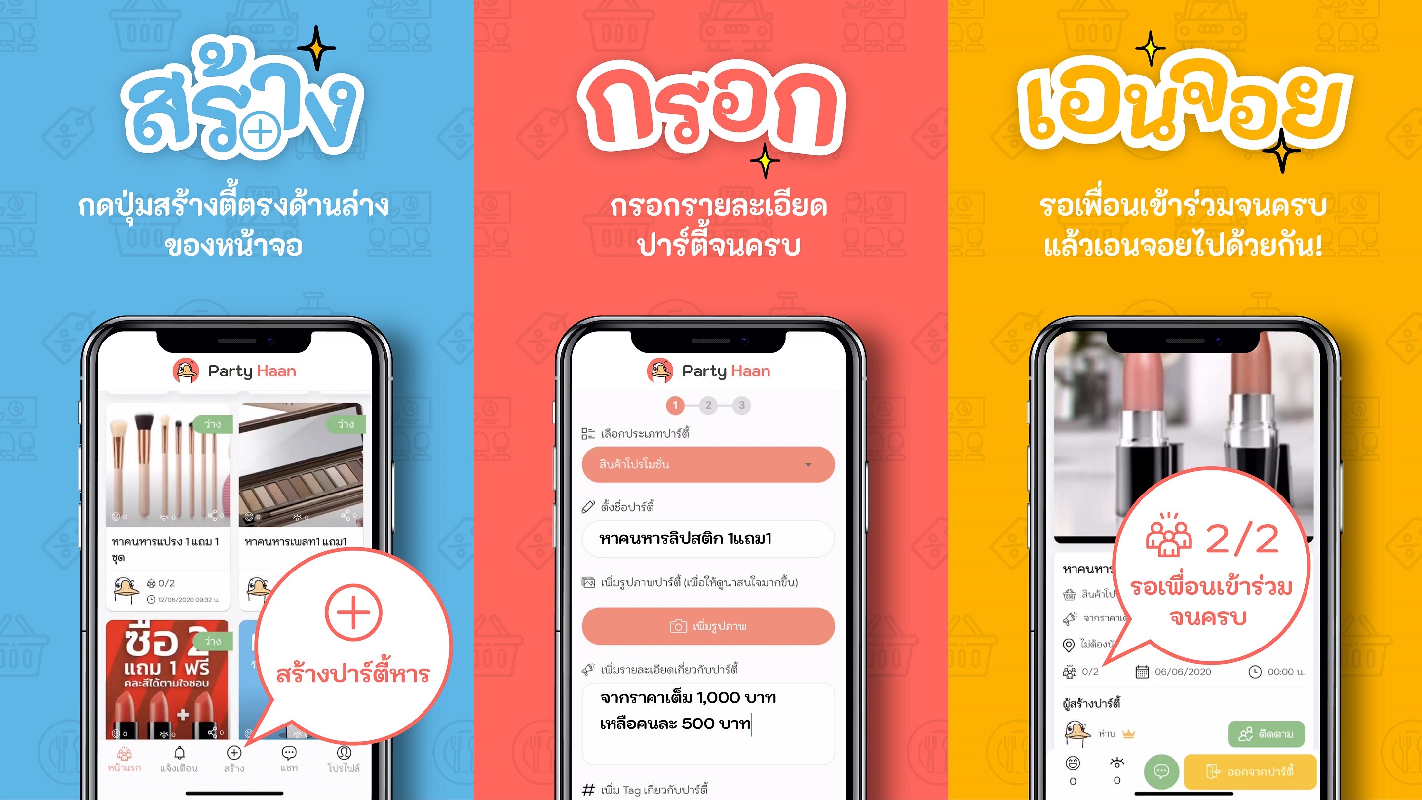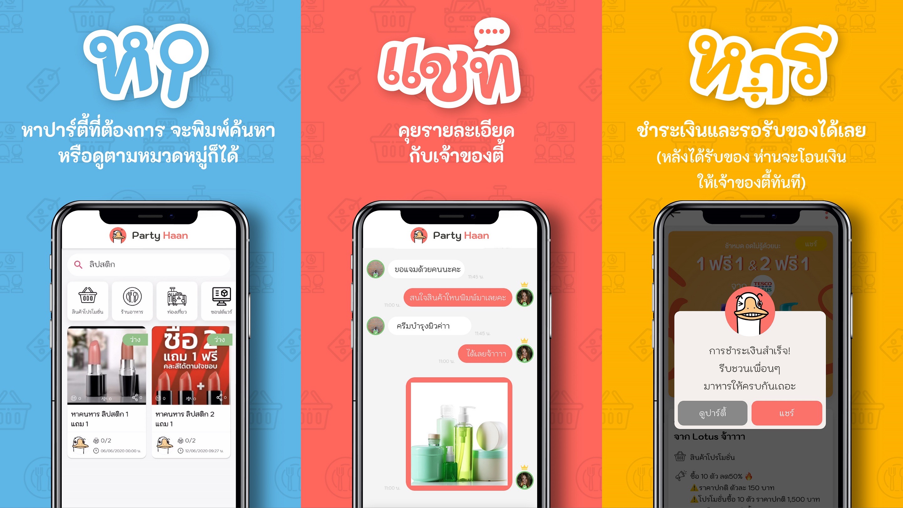 PartyHaan คือ แอปพลิเคชันที่ช่วยให้หาเพื่อนช่วยหาร ช่วยแชร์ค่าสินค้าและบริการต่าง ๆ ได้ง่าย ๆ ไม่ว่าจะเป็น โปรโมชันซื้อ 1 แถม 1, เครื่องสำอาง, โปรโมชั่นร้านอาหารมา 4 จ่าย 3, แชร์ค่าทริป, แชร์ค่าเดินทาง และอื่น ๆ อีกมากมาย สามารถเข้าร่วมปาร์ตี้ หรือสร้างปาร์ตี้เองได้ อีกทั้งสามารถ หาร จ่าย จบครบในแอปเดียวได้อีกด้วย