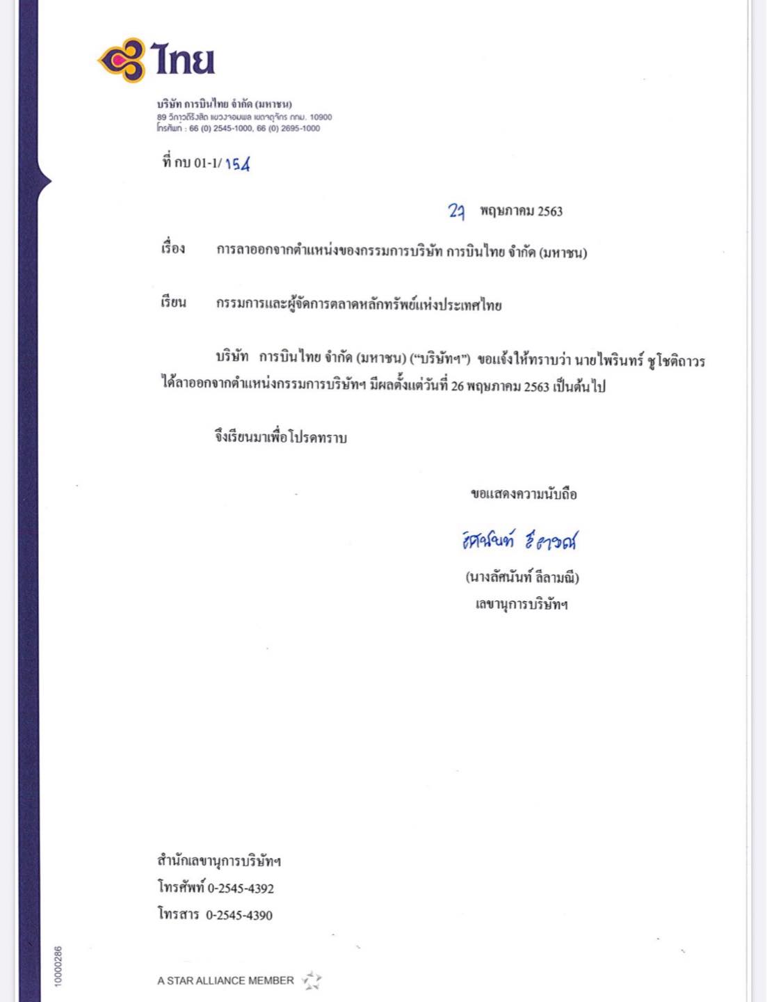 บริษัท การบินไทย จำกัด (มหาชน) ทำหนังสือแจ้งต่อตลาดหลักทรัพย์แห่งประเทศไทยว่า คุณไพรินทร์ ชูโชติถาวร ลาออกจากตำแหน่งกรรมการบริษัทฯ มีผลวันที่ 26 พฤษภาคม 2563 เป็นต้นไป
