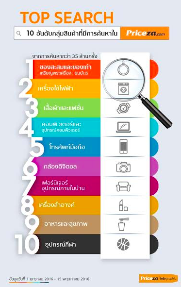 นอกจากนี้ ไพรซ์ซ่ายังได้ทำการรวบรวมสถิติกลุ่มสินค้า 10 อันดับแรก ที่มีผู้เข้ามาค้นหาและเปรียบเทียบราคามากที่สุดจากจำนวนการค้นหากว่า 35 ล้านครั้งผ่านทาง www.priceza.com ในช่วงครึ่งปีแรกที่ผ่านมา (ข้อมูลระหว่าง 1 มกราคม – 15 พฤษภาคม 2559)