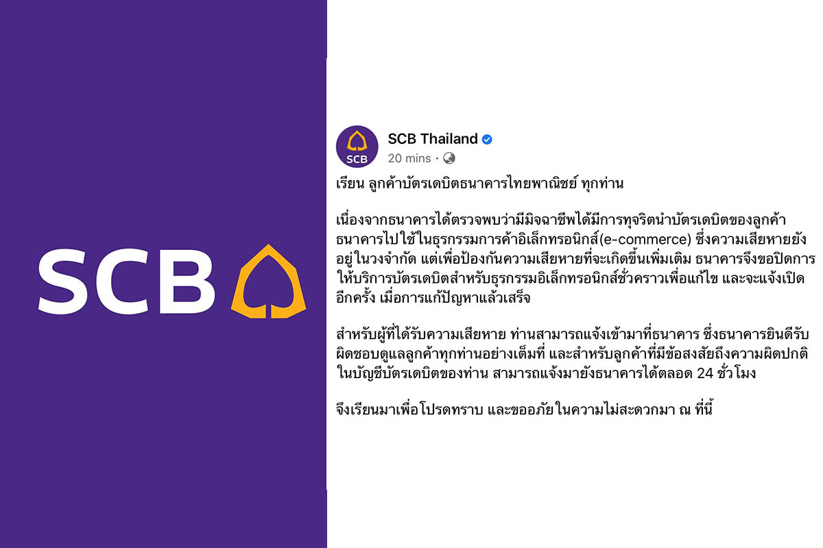 SCB ประกาศผ่านทาง Facebook : SCB Thailand โดยแจ้งลูกค้าแจ้งปิดการให้บริการบัตรเดบิตผ่านทางธุรกรรมอิเล็กทรอนิกส์ชั่วคราว เหตุมิจฉาชีพได้นำบัตรลูกค้าไปใช้ ซึ่งสร้างความเสียหายในวงจำกัด