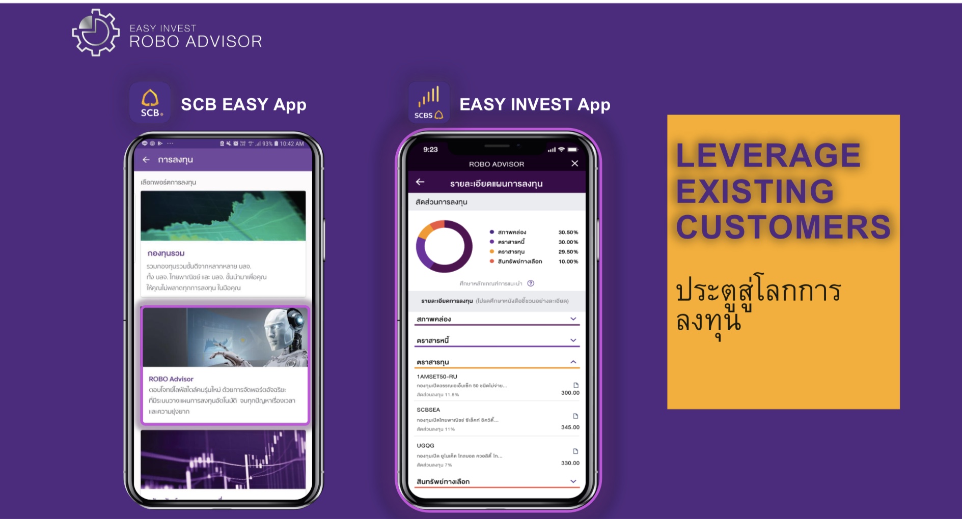 รวมถึงวางตัวแอพพลิเคชั่น EASY INVEST ให้เป็นระบบการซื้อขายที่เข้าถึงง่ายตอบโจทย์ความต้องการของลูกค้าโดยในช่วงแรกสามารถซื้อขายกองทุนรวม และตราสารหนี้ ทั้งแบบ DIY และ Automated Service ได้แก่ Robo Advisor บริหารพอร์ตกองทุนรวมอัตโนมัติด้วยสมองกลอัจฉริยะ หรือ AI (Artificial Intelligence) เป็นรายแรกในไทยเพื่อให้ผู้ลงทุนบรรลุเป้าหมายการลงทุนได้ง่ายขึ้น และกำลังพัฒนาอย่างต่อเนื่องเพื่อให้รองรับผลิตภัณฑ์ทางการเงินอื่น เช่น กองทุนรวมต่างประเทศ เป็นต้น