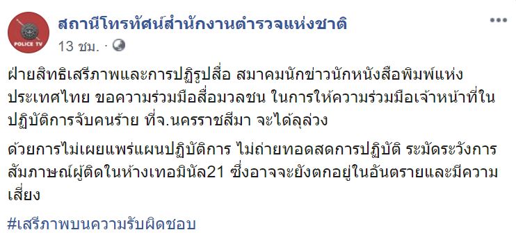 ทั้งนี้ ขณะที่เกิด hashtag นี้ Facebook ของสถานีโทรทัศน์สำนักงานตำรวจแห่งชาติยังได้โพสต์ว่า “ฝ่ายสิทธิเสรีภาพและการปฏิรูปสื่อ สมาคมนักข่าวนักหนังสือพิมพ์แห่งประเทศไทย ขอความร่วมมือสื่อมวลชน ในการให้ความร่วมมือเจ้าหน้าที่ในปฏิบัติการจับคนร้าย ที่จ.นครราชสีมา จะได้ลุล่วง ด้วยการไม่เผยแพร่แผนปฏิบัติการ ไม่ถ่ายทอดสดการปฏิบัติ ระมัดระวังการสัมภาษณ์ผู้ติดในห้างเทอมินัล21 ซึ่งอาจจะยังตกอยู่ในอันตรายและมีความเสี่ยง #เสรีภาพบนความรับผิดชอบ”