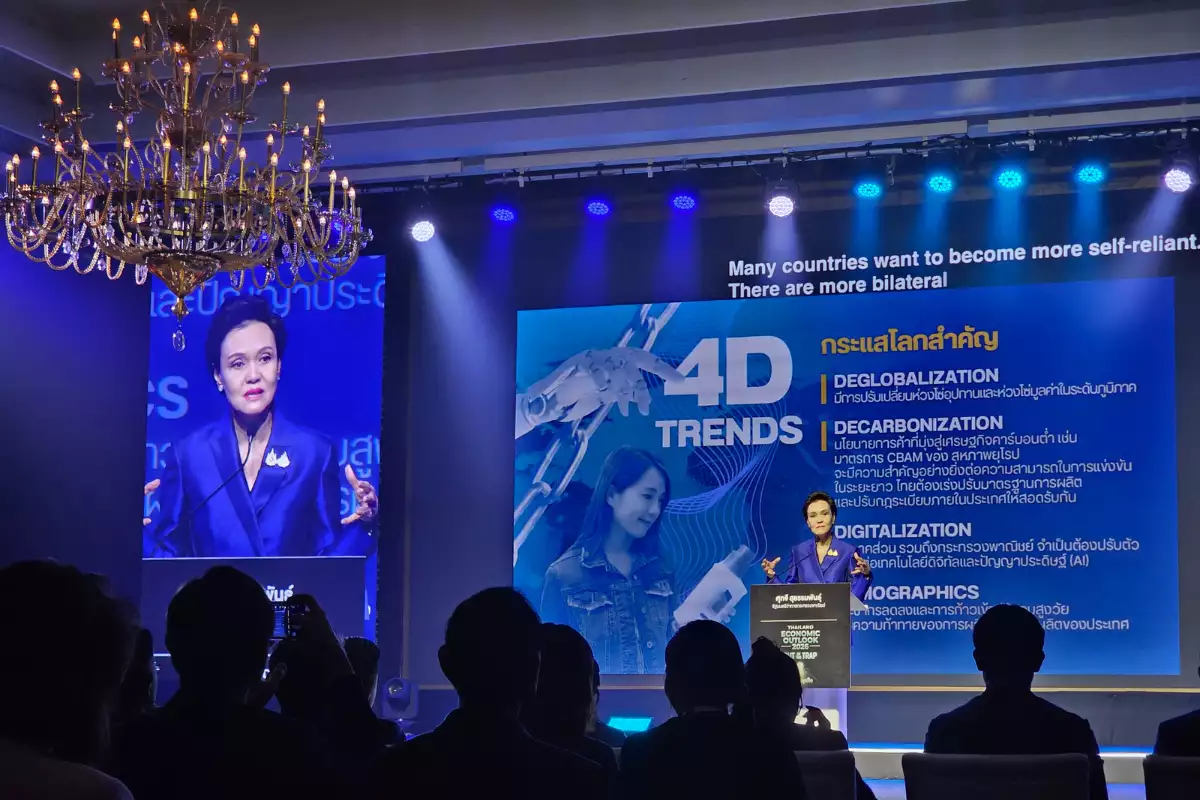 คุณศุภจีตอกย้ำว่า ไทยไม่ได้ต่อสู้อย่างโดดเดี่ยว แต่กำลังเผชิญกับ Global Headwind หรือลมต้านระดับโลกที่รุนแรง ไม่ว่าจะเป็นภาวะเศรษฐกิจโลกชะลอตัวและสมรภูมิภูมิรัฐศาสตร์ (Geopolitics) ที่ทำให้การค้าโลกปั่นป่วน เกิดกำแพงภาษีรูปแบบใหม่ๆ บีบให้ผู้ประกอบการไทยต้องปรับตัวครั้งใหญ่ แต่หัวใจสำคัญคือ 4 เมกะเทรนด์ ที่กำลังเปลี่ยนโลกอย่างสิ้นเชิง