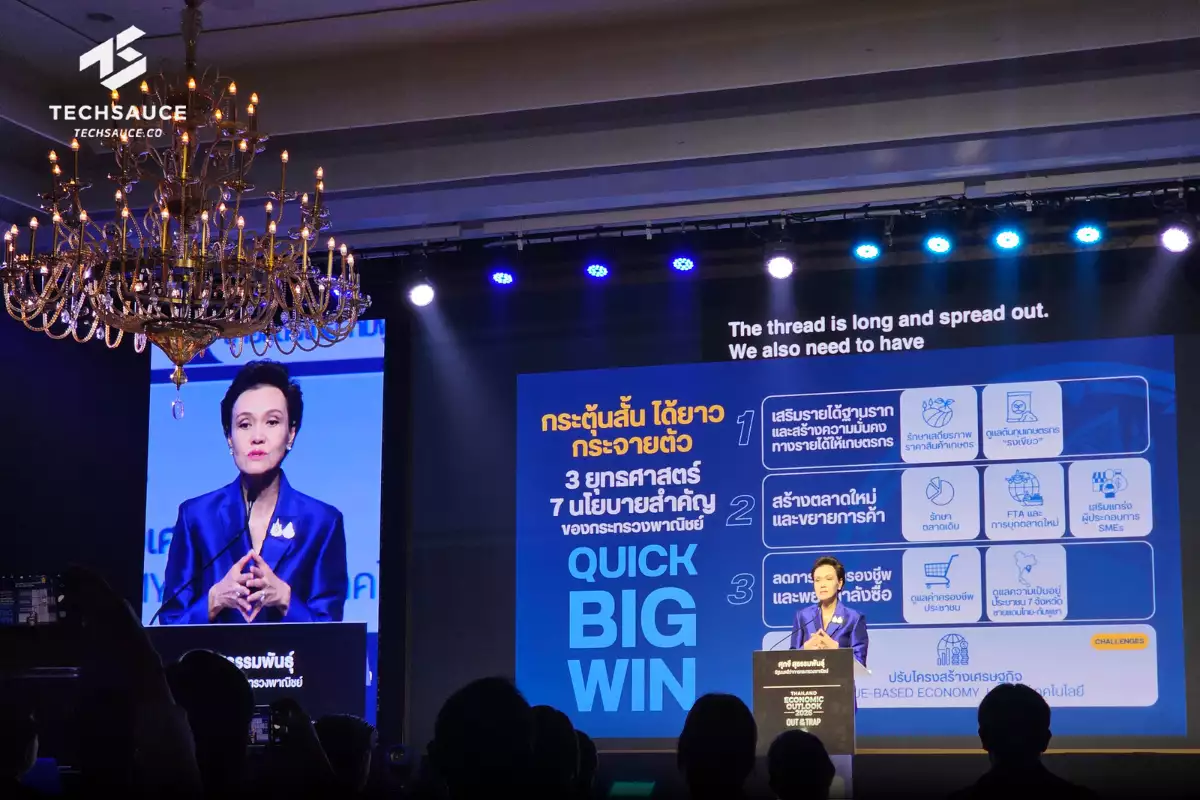 ภายในงาน ‘Thailand Economic Outlook 2026 Out of the Trap’ ทุกสายตาจับจ้องไปที่ Keynote ของ คุณศุภจี สุธรรมพันธุ์ รัฐมนตรีว่าการกระทรวงพาณิชย์ ที่ไม่ได้มาเพียงเพื่อฉายภาพความท้าทาย แต่มาพร้อมพิมพ์เขียวเชิงรุก เพื่อพาเศรษฐกิจไทยออกจาก ‘กับดัก’ ที่ฉุดรั้งการเติบโตมานานหลายปี ท่ามกลางภูมิทัศน์โลกที่ซับซ้อนและแรงกดดันรอบด้าน นี่ไม่ใช่แค่การแก้เกมระยะสั้น แต่คือการวางรากฐานใหม่เพื่อการเติบโตที่ยั่งยืน