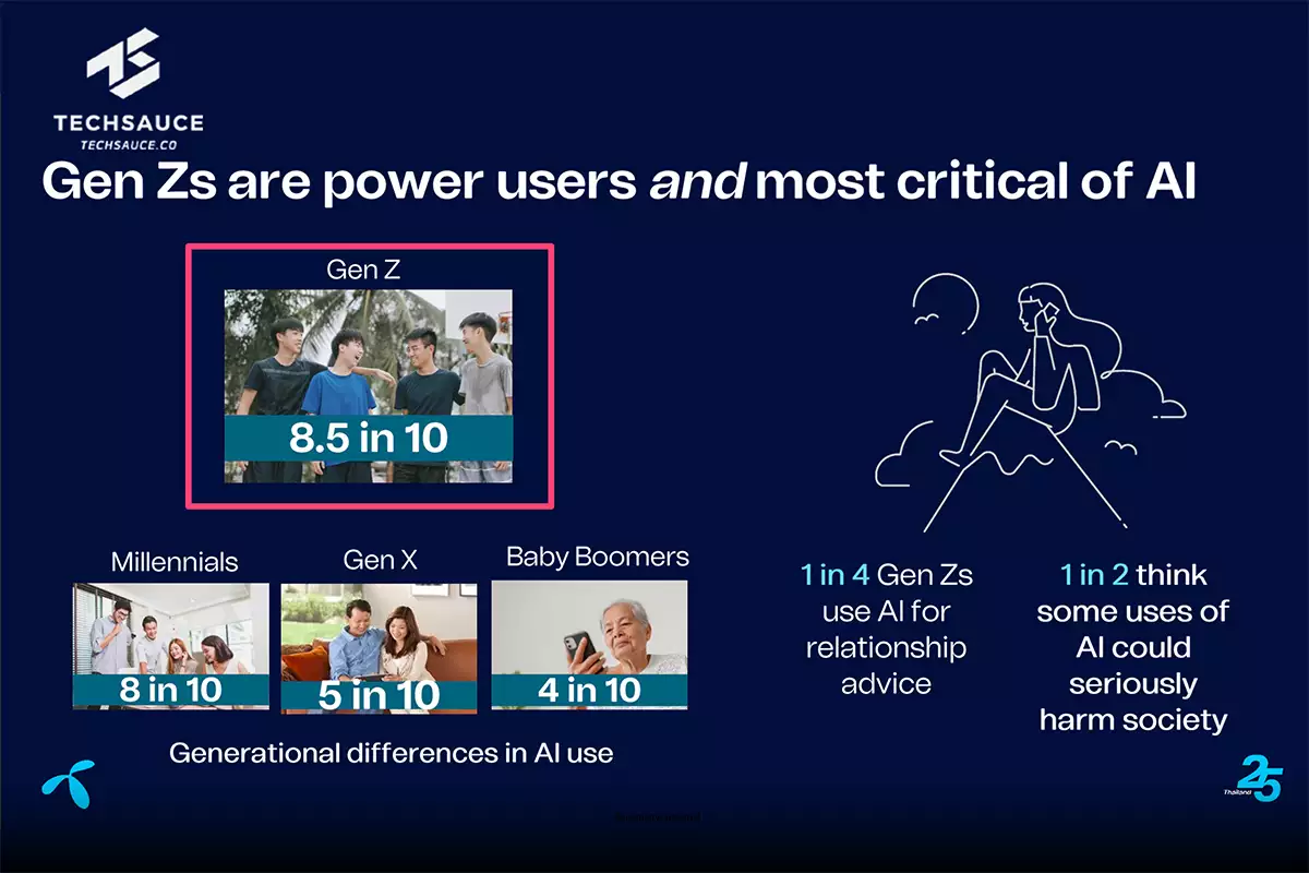 กลุ่มมิลเลนเนียล (Millennials) และ Gen Z ขึ้นแท่นกลุ่มคนที่นำ AI มาใช้มากที่สุด ครอบคลุมตั้งแต่การสร้างสรรค์คอนเทนต์ไปจนถึงการขอคำปรึกษาเรื่องความสัมพันธ์ โดย Gen Z มีแนวโน้มระมัดระวังและสนับสนุนการกำกับดูแลมากกว่ามิลเลนเนียล ซึ่งมีท่าทีเปิดกว้างและมุมมองเชิงบวกต่อบทบาทของ AI ในสังคม ขณะที่ Gen X และเบบี้บูมเมอร์ (Baby Boomers) แสดงความกังวลในระดับปานกลาง แต่ยังสนับสนุนการพัฒนา AI อย่างมีความรับผิดชอบ