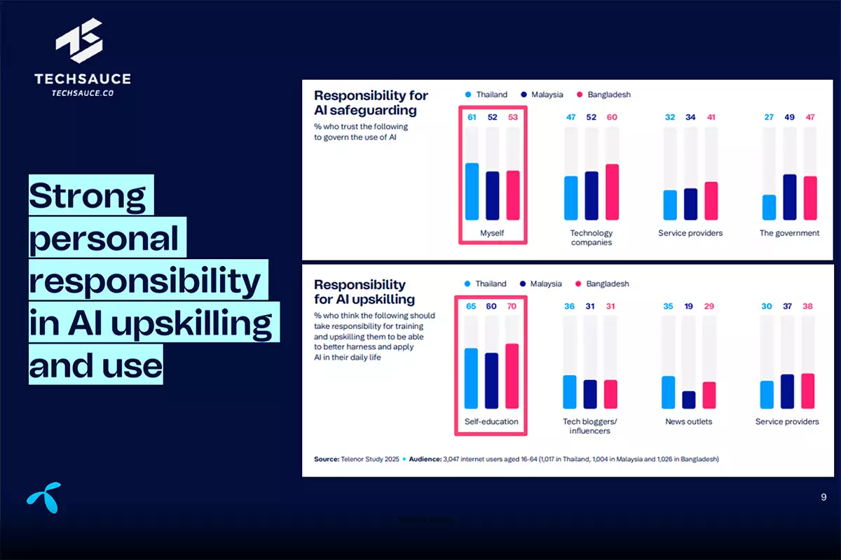 ดร. Leva Martinkenaite, SVP and Head of AI at Telenor Group กล่าวเสริมว่า ผลการสำรวจครั้งนี้สะท้อนว่า ผู้ใช้อินเทอร์เน็ตในไทยคาดหวังให้ระบบ AI มีความโปร่งใส เข้าถึงได้ และยึดมนุษย์เป็นศูนย์กลาง ซึ่งควรเป็นมาตรฐานพื้นฐานของทุกองค์กร