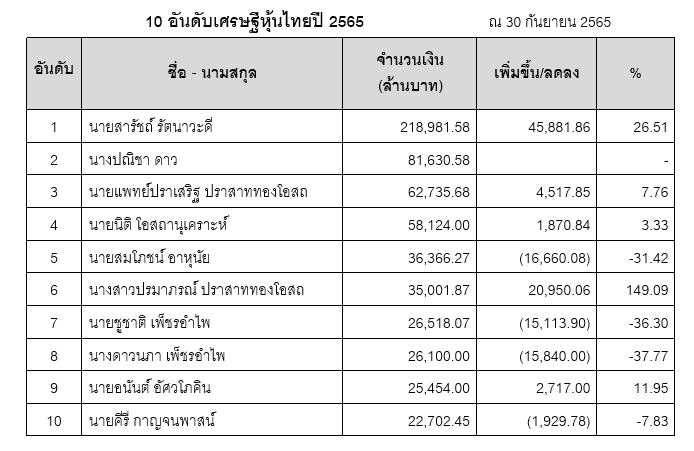 วารสารการเงินธนาคาร ร่วมกับอาจารย์ประจำคณะพาณิชยศาสตร์และการบัญชี จุฬาลงกรณ์มหาวิทยาลัย ทำการจัดอันดับเศรษฐีหุ้นไทยติดต่อกันปีนี้เป็นปีที่ 29 แล้ว โดยวัดจากผู้ถือหุ้นรายใหญ่ ประเภทบุคคลธรรมดาในประเทศ ที่ถือหุ้นสูงสุด 10 อันดับแรก ของบริษัทจดทะเบียนในตลาดหลักทรัพย์แห่งประเทศไทย (SET) และตลาด mai ตามการปิดสมุดทะเบียนผู้ถือหุ้นล่าสุดก่อนวันที่ 30 กันยายน 2565