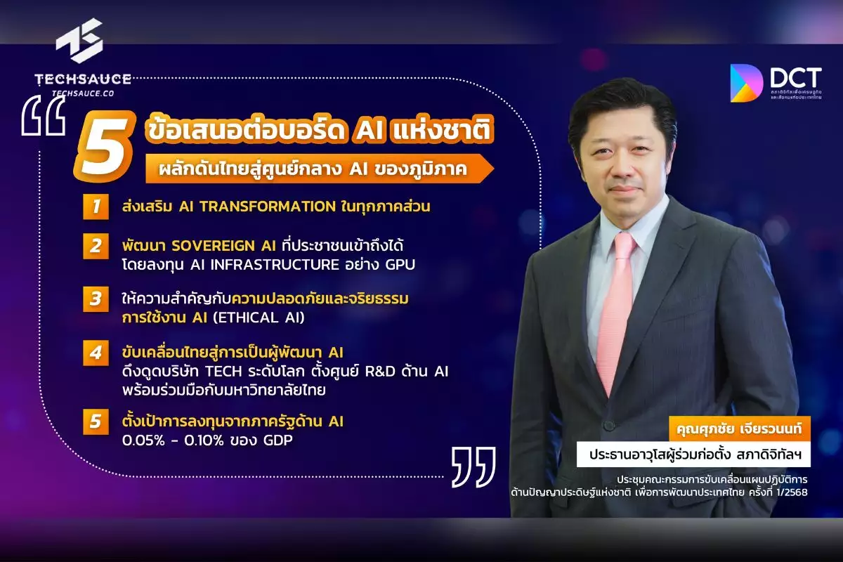 ในการนี้ สภาดิจิทัลเพื่อเศรษฐกิจและสังคมแห่งประเทศไทย (DCT) เข้าร่วมในฐานะองค์กรหลักด้านนโยบายดิจิทัลของประเทศ โดยมีนายศุภชัย เจียรวนนท์ ประธานอาวุโสผู้ร่วมก่อตั้ง ม.ร.ว. นงคราญ ชมพูนุท ประธานสภาฯ และดร.อธิป อัศวานันท์ ผู้อำนวยการสภาฯ ร่วมนำเสนอ 5 ยุทธศาสตร์สำคัญ เพื่อผลักดันให้ประเทศไทยก้าวขึ้นเป็นศูนย์กลางการพัฒนาเทคโนโลยี AI แห่งภูมิภาค พร้อมวางรากฐานการเติบโตทางเศรษฐกิจอย่างยั่งยืนในระยะยาว