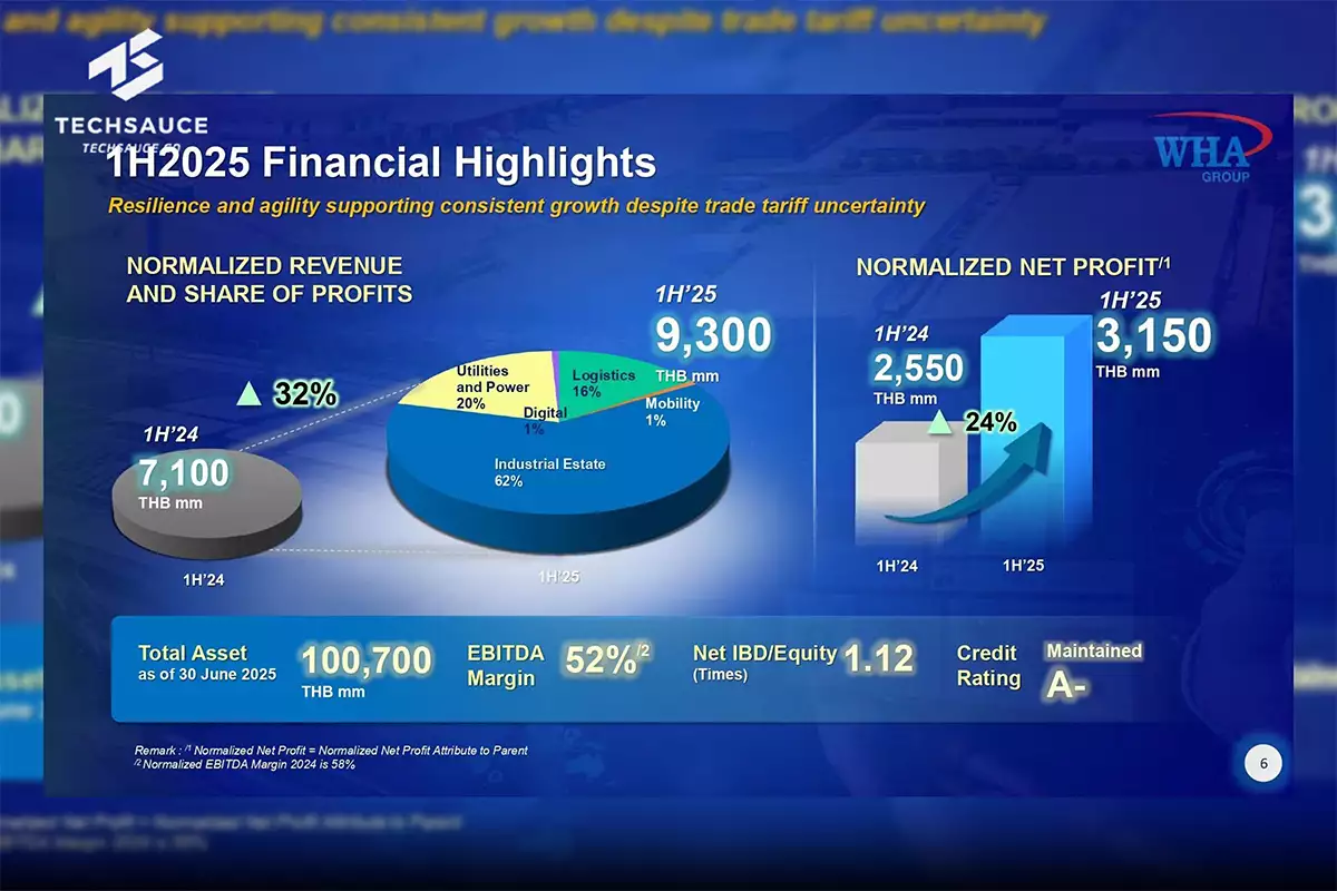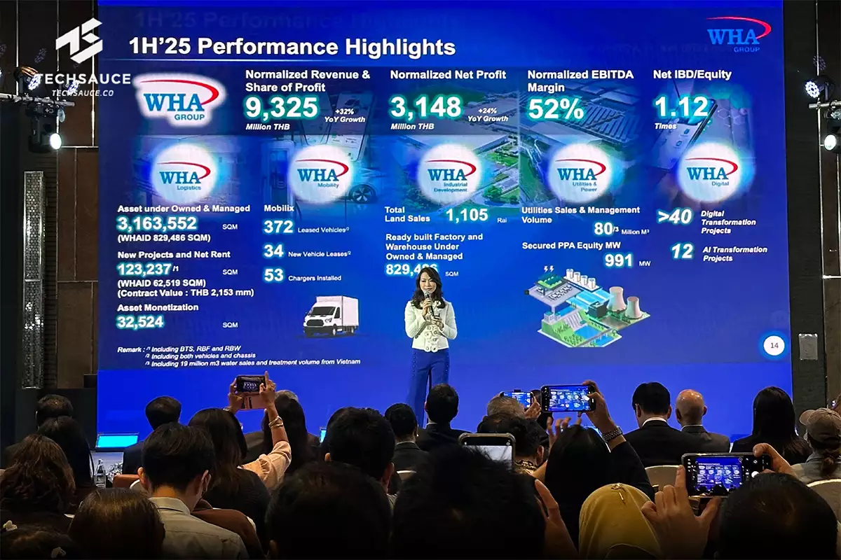 แม้ความท้าทายจากสภาพเศรษฐกิจโลกยังคงอยู่รอบด้าน แต่ บริษัท ดับบลิวเอชเอ คอร์ปอเรชั่น จำกัด (มหาชน) (WHA Group) ก็ยังเติบโตอย่างแข็งแกร่ง จากผลประกอบการครึ่งแรกปี 2568 แข็งแกร่งที่สุดเป็นประวัติการณ์ ด้วยรายได้รวมและส่วนแบ่งกำไร 9,325 ล้านบาท เพิ่มขึ้น 32% จากปีก่อน และกำไรปกติสูงสุด 3,148 ล้านบาท เติบโตขึ้น 24% กลายเป็นสถิติ All-Time High ที่เกิดต่อเนื่องกันมาแล้ว 3 ปี