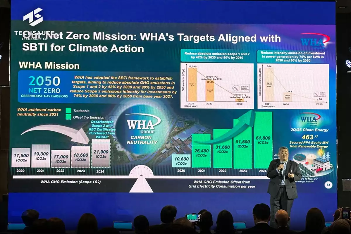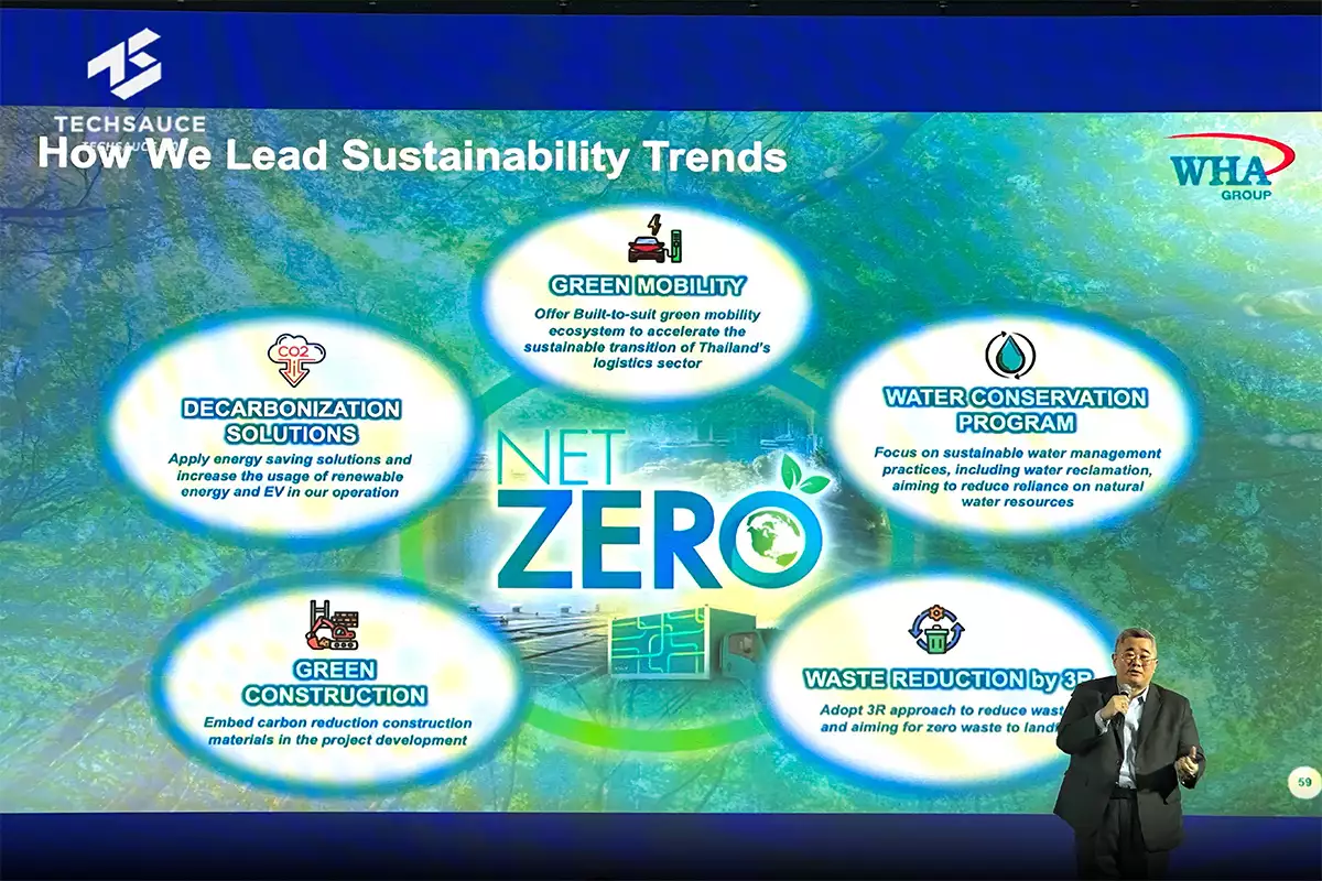 WHA Group ตั้งเป้ารายได้รวม 20,000 ล้านบาท ในปีนี้ ขณะเดียวกันยังเดินหน้าสู่เป้าหมาย Net Zero ภายในปี พ.ศ. 2593 (ค.ศ. 2050) ผ่าน 5 ภารกิจหลักด้าน ESG ภายใต้แนวคิด 'กรีนที่กินได้' ที่เชื่อว่าความยั่งยืนไม่ใช่ต้นทุน แต่คือการลงทุนเพื่ออนาคต ได้แก่