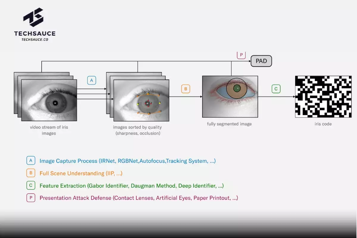 กล้อง และเซ็นเซอร์เหล่านี้ ถูกใช้เพื่อพิสูจน์ก่อนว่าสิ่งที่อยู่หน้าเครื่องคือ ดวงตาของมนุษย์จริงๆ (Liveness Detection) ไม่ใช่ภาพถ่ายหรือหุ่นยนต์ จากนั้น ข้อมูลชีวมิติที่จะถูกนำไปใช้ยืนยันความไม่ซ้ำใครคือ ‘ม่านตา’