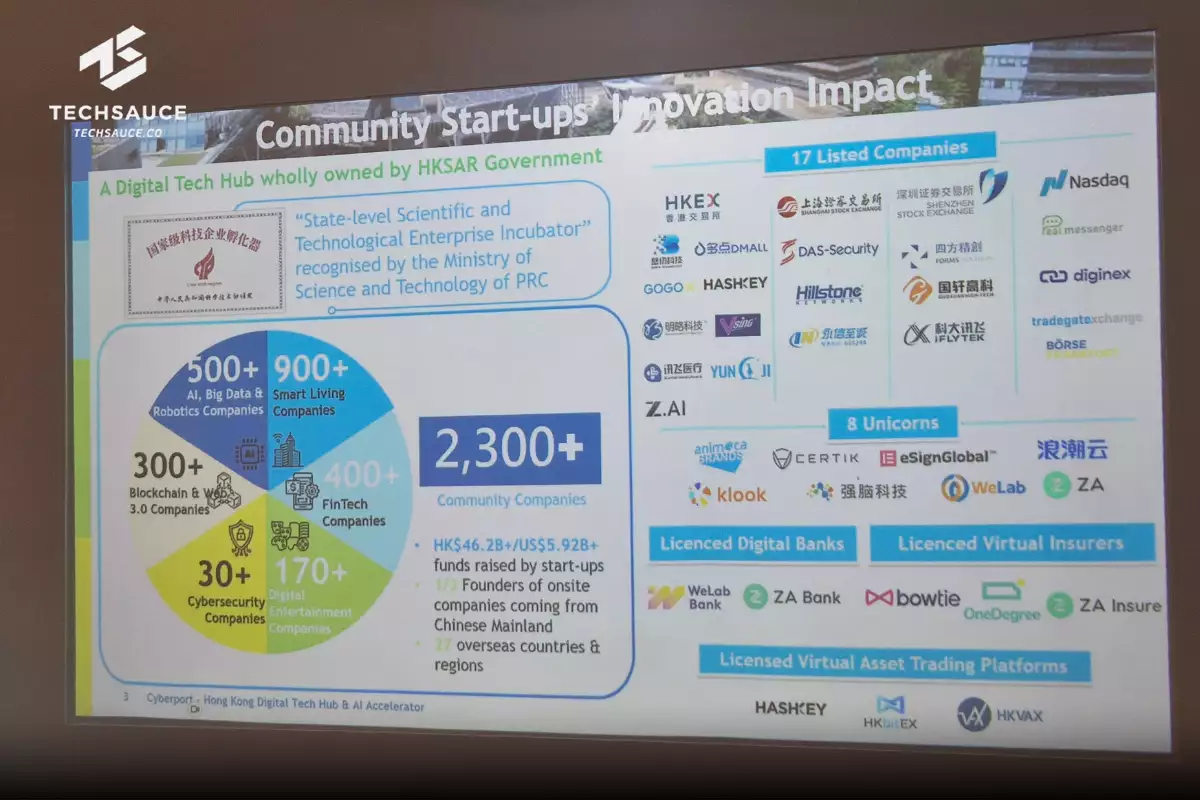 Cyberport นับว่าเป็นหนึ่งในตัวแปรสำคัญในภาพการเงินที่แข็งแรก่งฮ่องกง ปัจจุบันมีบริษัทใน Community มากกว่า 2,300 ราย และในนั้นมี Fintech มากกว่า 440 ราย รวมถึงยูนิคอร์น 8 ราย ธนาคารดิจิทัลที่ได้รับใบอนุญาต 2 แห่ง บริษัทประกันเสมือน 3 ใน 4 แห่ง และแพลตฟอร์มซื้อขายสินทรัพย์เสมือนที่ได้รับใบอนุญาต 3 ราย