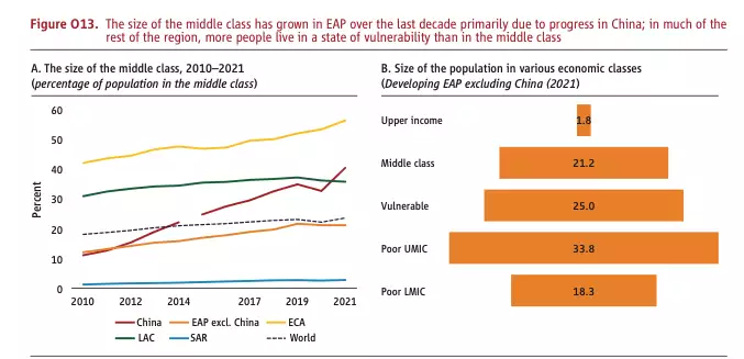 ส่วนชนชั้นกลางหมายถึง กลุ่มคนที่มีรายได้ต่อหัว/การบริโภคอยู่ระหว่าง 15-56 ดอลลาร์สหรัฐต่อวัน นับเป็นกลุ่มที่มีรายได้และความมั่นคงในระดับที่สามารถบริโภคและลงทุนเพื่ออนาคตได้