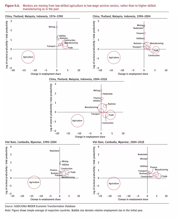 หากเราเทียบกับในอดีตช่วงปี 1970-1990 การจ้างงานเคยเปลี่ยนทิศทางจากภาคเกษตรไปสู่อุตสาหกรรมและบริการที่มีผลิตภาพสูง ซึ่งเป็นหัวใจสำคัญที่สร้างการเติบโตทางเศรษฐกิจและชนชั้นกลางในประเทศอย่างไทยและมาเลเซีย