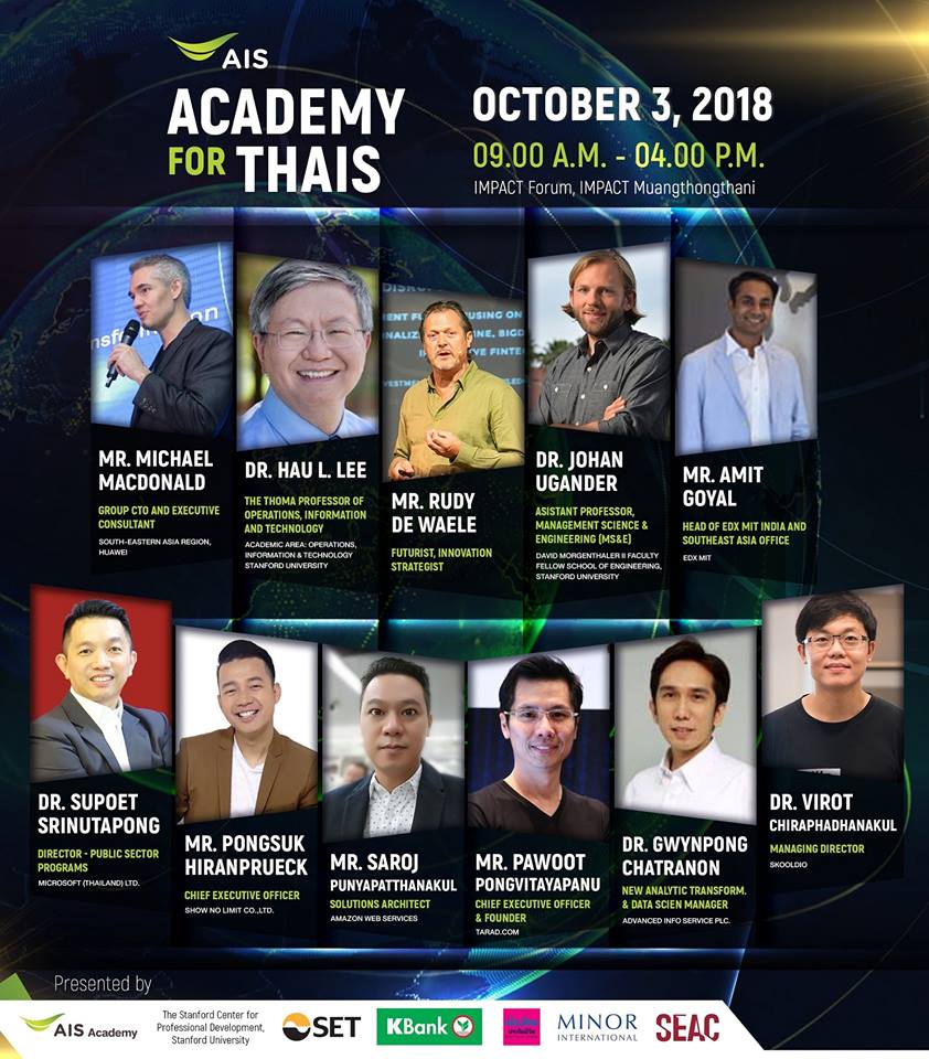 งานสัมมนา ACADEMY for THAIs เกิดขึ้นด้วยความร่วมมือจากหลายองค์กรชั้นนำทั้งในและต่างประเทศ ได้แก่ ตลาดหลักทรัพย์แห่งประเทศไทย, ธนาคารกสิกรไทย, บริษัทเมืองไทยประกันชีวิต จำกัด (มหาชน) และ Minor International ซึ่งล้วนเป็นองค์กรที่มีแนวคิดและมุ่งสร้างความพร้อม ความเข้มแข็งด้าน Digital Transformation ให้กับบุคลากรภายในองค์กรและยึดมั่นร่วมมือกันในหมู่พันธมิตรในการสร้างสังคมให้ยั่งยืน โดยภายในงานจะมีการเสวนา ถ่ายทอดประสบการณ์ปรับตัวให้เข้ากับสถานการณ์ของเทคโนโลยีที่เปลี่ยนแปลงอย่างรวดเร็ว เพื่อปรับมุมมองและเพิ่มความสามารถในการปรับตัวสู่โลกแห่งเทคโนโลยี ไฮไลท์สำคัญที่จะเกิดขึ้นภายในงานนี้ เราได้รับความร่วมมือจาก South East Asia Center หรือ SEAC ในฐานะศูนย์พัฒนาผู้นำและผู้บริหารระดับสูงระดับนานาชาติ ประสานความร่วมมือกับมหาวิทยาลัยสแตนฟอร์ดในการคัดสรรวิทยากรผู้มีประสบการณ์ตรงด้าน Digital Disruption เป็นที่ยอมรับในระดับโลก ได้แก่ Mr.Hau L. Lee / Mr.Rudy De Waele / Dr.Johan Ugander มาร่วมถ่ายทอดองค์ความรู้ด้านเทคโนโลยีและนวัตกรรมที่กำลังอยู่ในความสนใจและจะเกิดขึ้นในอนาคต สะท้อนให้เห็นถึงความสำคัญของการเตรียมตัวเองและการปรับเปลี่ยนวิถีการดำเนินธุรกิจในภาคส่วนต่างๆ ได้อย่างชัดเจนยิ่งขึ้น พร้อมจึงได้รับเกียรติจากวิทยากรอีกมากมาย ซึ่งล้วนแต่เป็นผู้อยู่ในแวดวงธุรกิจที่ได้เรียนรู้และปรับตัวเท่าทันต่อกระแสการเปลี่ยนแปลงของเทคโนโลยี อาทิ ดร.สุพจน์ ศรีนุตพงษ์ ผู้อำนวยการโครงการภาครัฐ บริษัท ไมโครซอฟต์ (ประเทศไทย) จำกัด, คุณพงศ์สุข หิรัญพฤกษ์ ประธานกรรมการบริหาร บริษัท โชว์ไร้ขีด จำกัด, คุณภาวุธ พงษ์วิทยภานุ กรรมการผู้จัดการและผู้ก่อตั้งเว็บไซต์ บริษัท TARAD.com ร่วมพัฒนาองค์ความรู้และส่งเสริมศักยภาพด้านเทคโนโลยีครั้งนี้ไปด้วยกัน