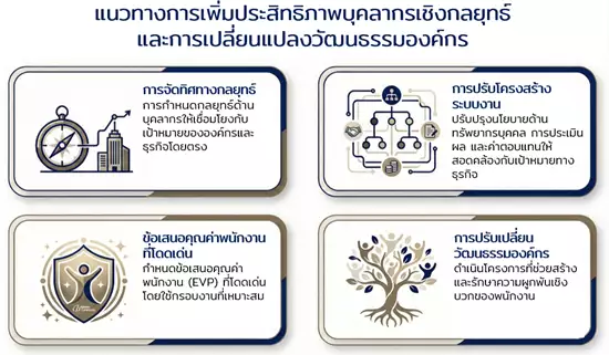 โดยองค์กรที่ประสบความสำเร็จในการดำเนินกลยุทธ์มักมีลักษณะร่วมกันอย่างหนึ่ง นั่นคือการมีวัฒนธรรมองค์กรที่ช่วยเสริมประสิทธิภาพแทนที่จะเป็นอุปสรรคในการทำงาน