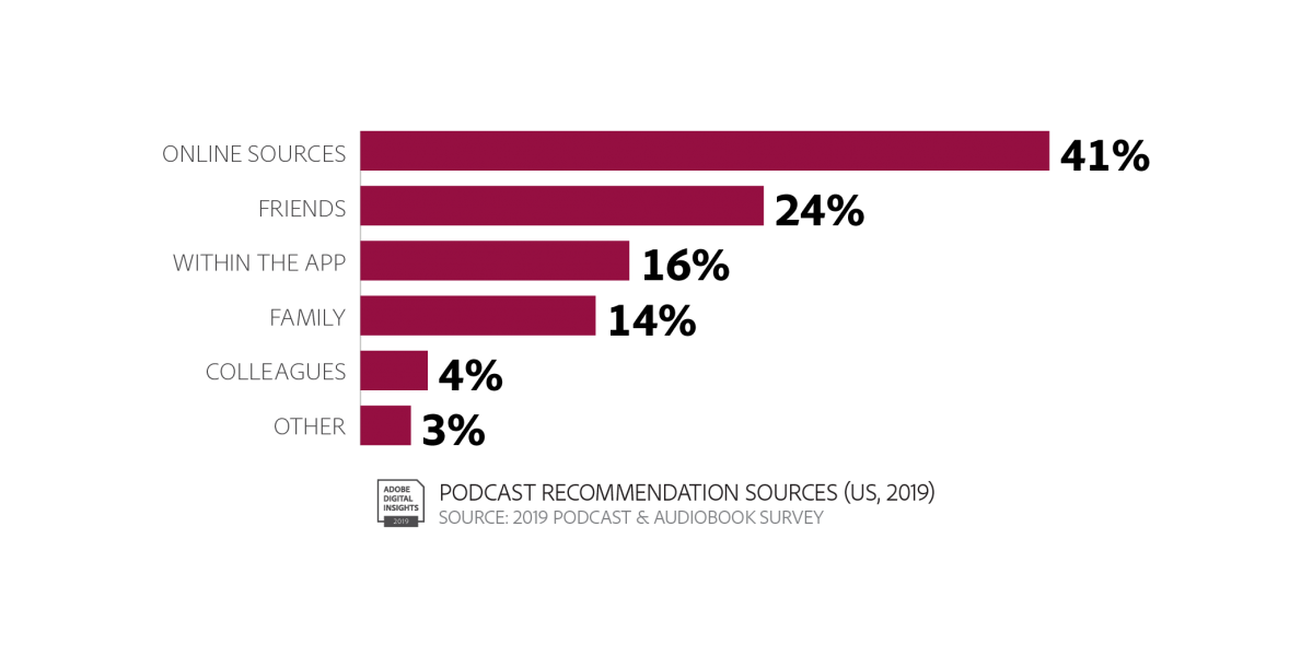 ผลการศึกษาดังกล่าวระบุว่า การใช้งานโมบายล์แอป Podcast เพิ่มขึ้น 60% ตั้งแต่เดือนมกราคม 2018 โดยหนึ่งในสี่ของผู้ฟัง Podcast ในปัจจุบันเพิ่งเคยใช้งานเป็นครั้งแรกในช่วง 6 เดือนที่ผ่านมา Adobe Analytics คาดว่า แนวโน้มการเติบโตนี้จะยังคงดำเนินต่อไป ขณะที่ผู้ฟัง 45% ระบุว่าตนเองมีแผนที่จะฟัง Podcast เพิ่มมากขึ้นในอนาคต โดยพวกเขาจะค้นหารายการพอดคาสต์ผ่านบล็อกออนไลน์และบทความเป็นหลัก (41%)