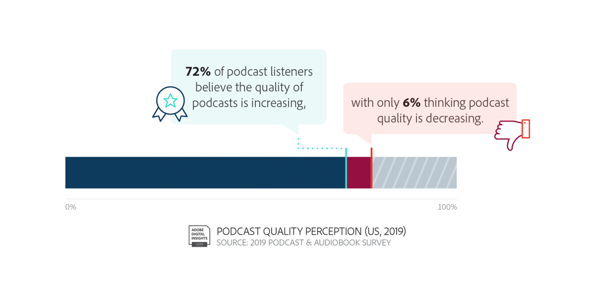 วีเว็ก ปันด์ยา นักวิเคราะห์บริหารของ Adobe Digital Insights กล่าวว่า “เราเชื่อว่าในช่วงแรกๆ Podcast อยู่ในช่วงของการทดลอง และแบรนด์ต่างๆ ไม่ได้ลงทุนมากนักในเรื่องของคุณภาพ แต่เมื่อตลาด Podcast โตขึ้น และมีแบรนด์เริ่มให้ความสนใจเข้าร่วมมากขึ้น คุณภาพการผลิตจึงกลายเป็นเรื่องสำคัญ”
